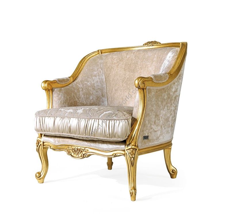 This is an armchair with a frame made on pantograph, hand finished beech wood. Non deformable polyurethane foam upholstery. Back padded with goose feather. Reversible seat cushion with down filling and Super Soft System.