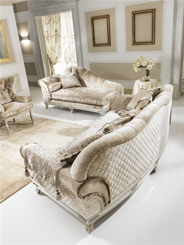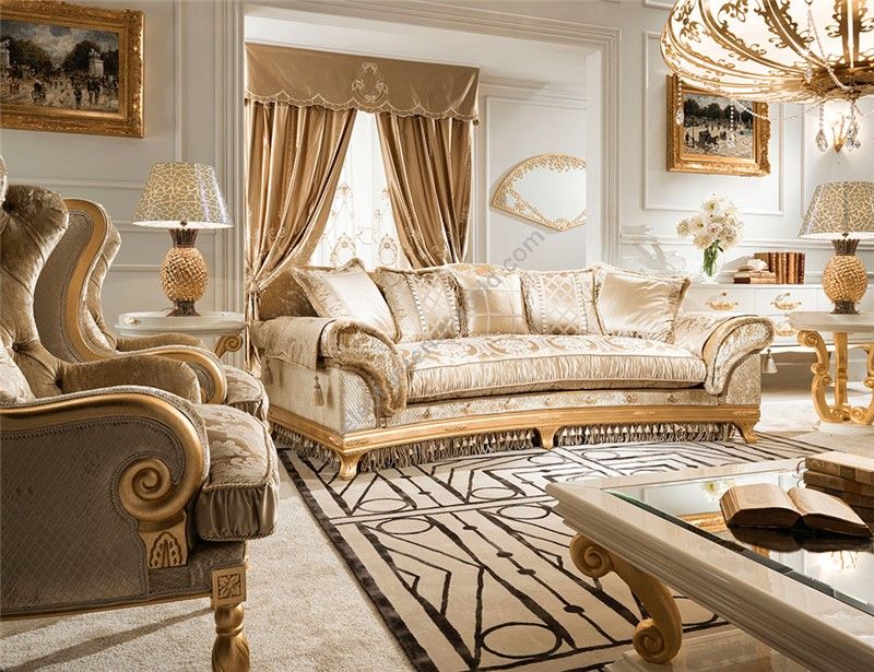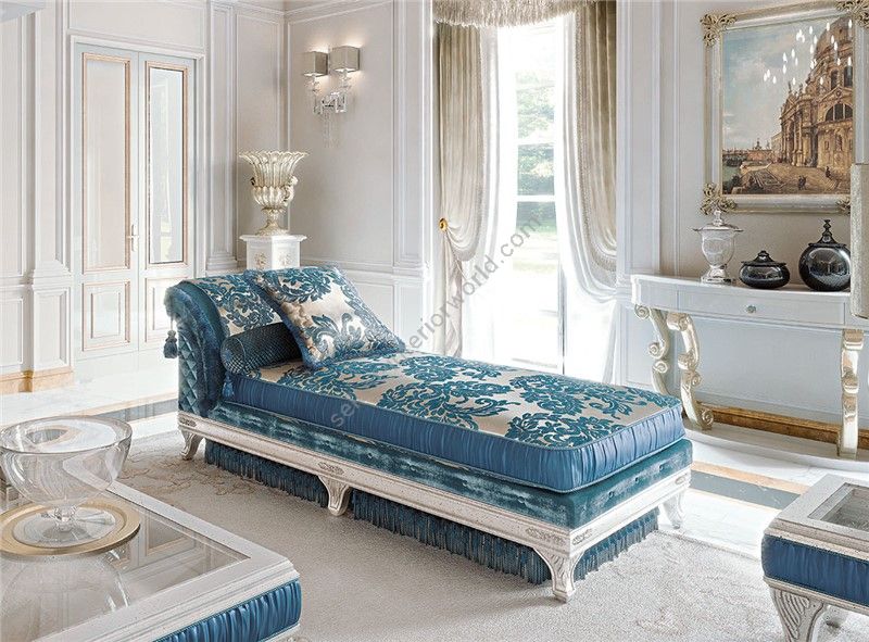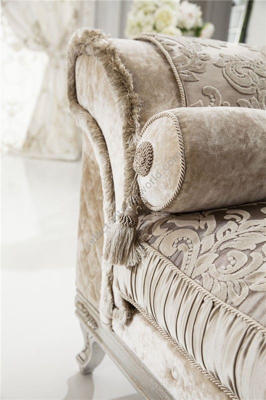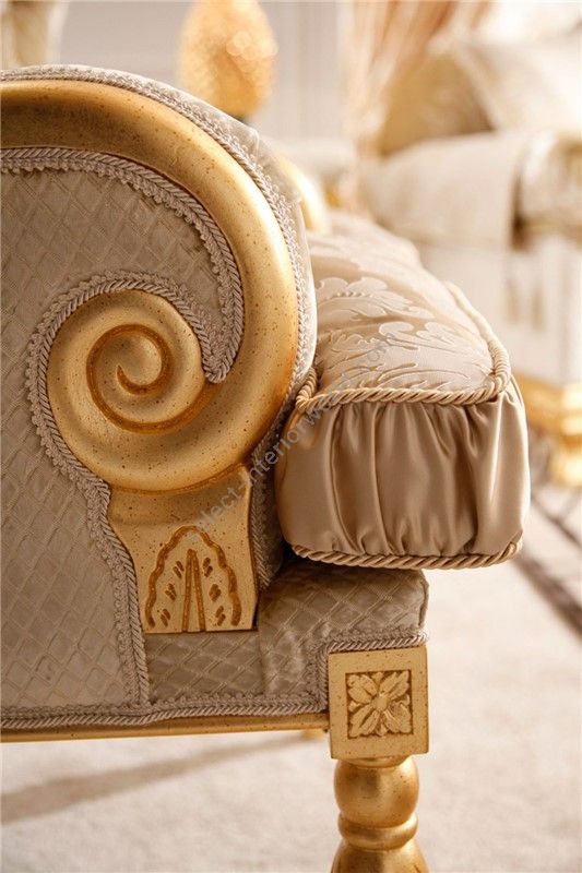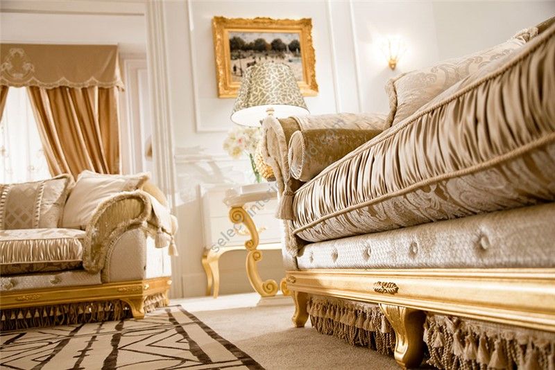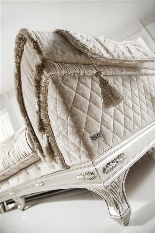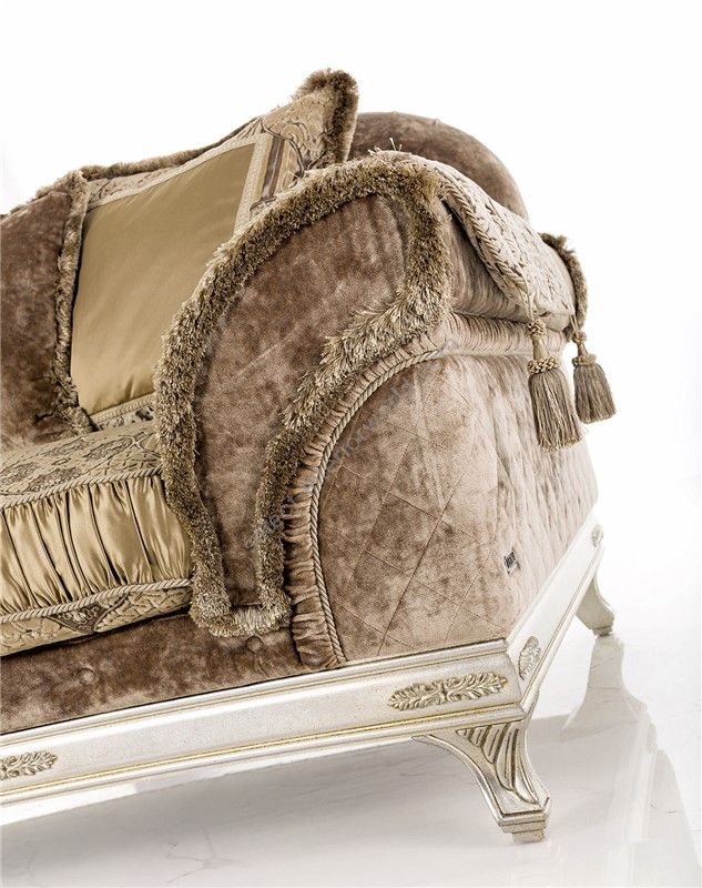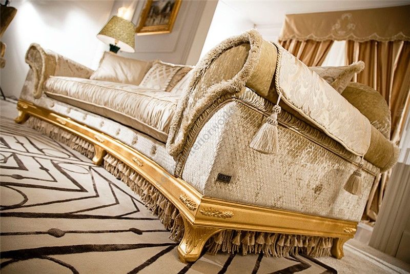 Sofa with a semiremovable seat covering. Fir wood and poplar multilayer structure. Non-deformable polyurethane foam upholstery with different densities. Reversible seat cuschions with down filling and SUPER-SOFT-SYSTEM springs. Armrest coverings, two upholstered cuschions and beechwood feet. Upon request cuschions and backrests adorned with fringed ribbon. Finish in gold or silver leaf with a choice of premium price. There is a bed version with one electro-welded standard support with H12 spring mattress.