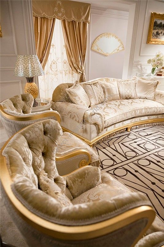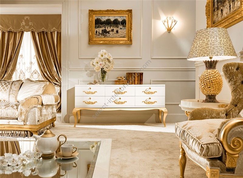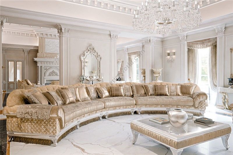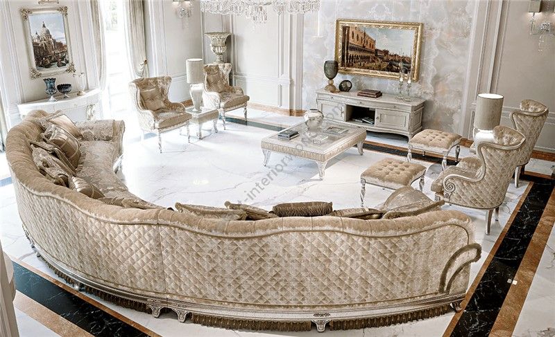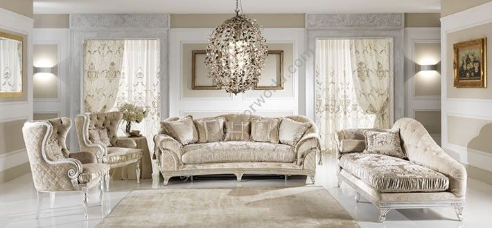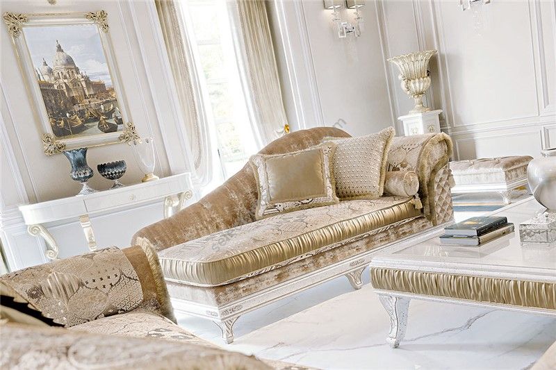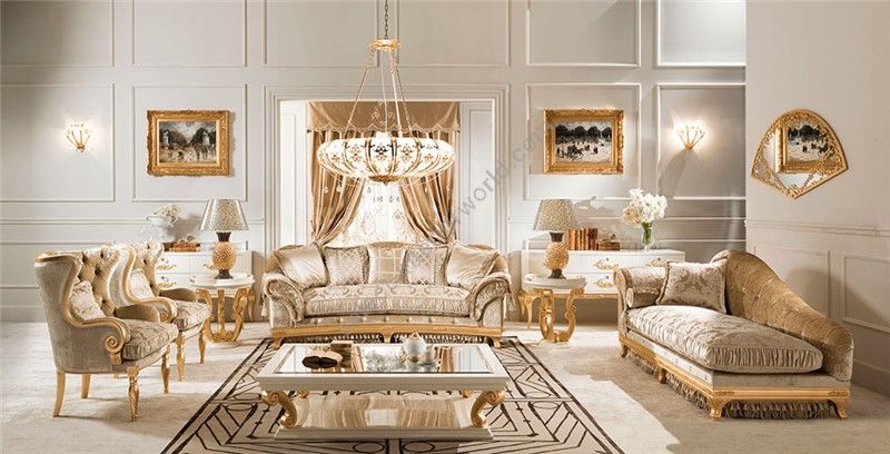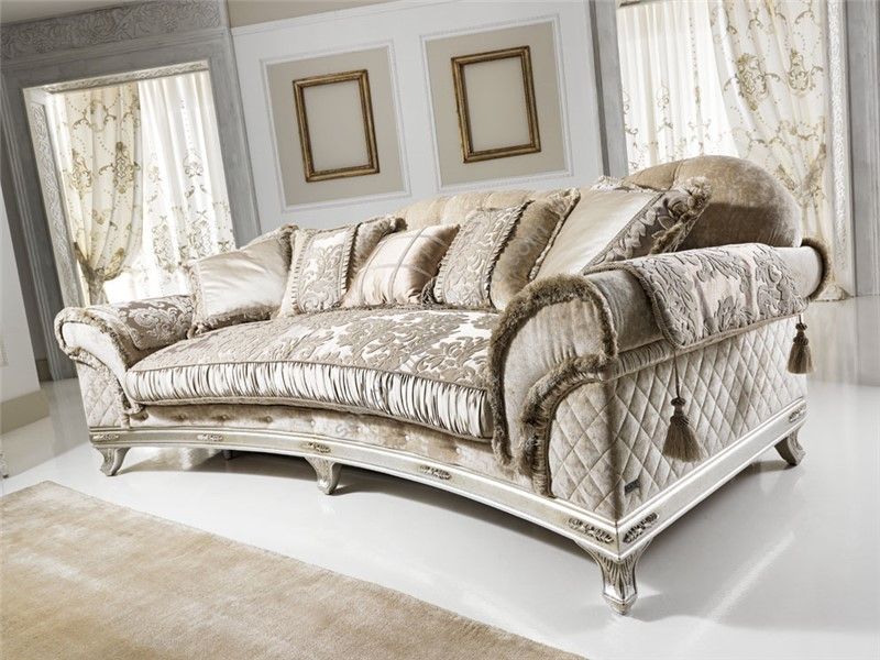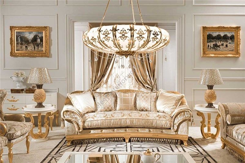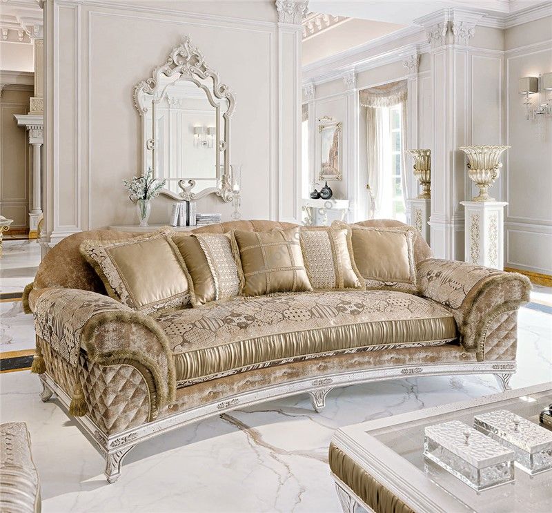 Sofa with a semiremovable seat covering. Fir wood and poplar multilayer structure. Non-deformable polyurethane foam upholstery with different densities. Reversible seat cuschions with down filling and SUPER-SOFT-SYSTEM springs. Armrest coverings, two upholstered cuschions and beechwood feet. Upon request cuschions and backrests adorned with fringed ribbon. Finish in gold or silver leaf with a choice of premium price. There is a bed version with one electro-welded standard support with H12 spring mattress.