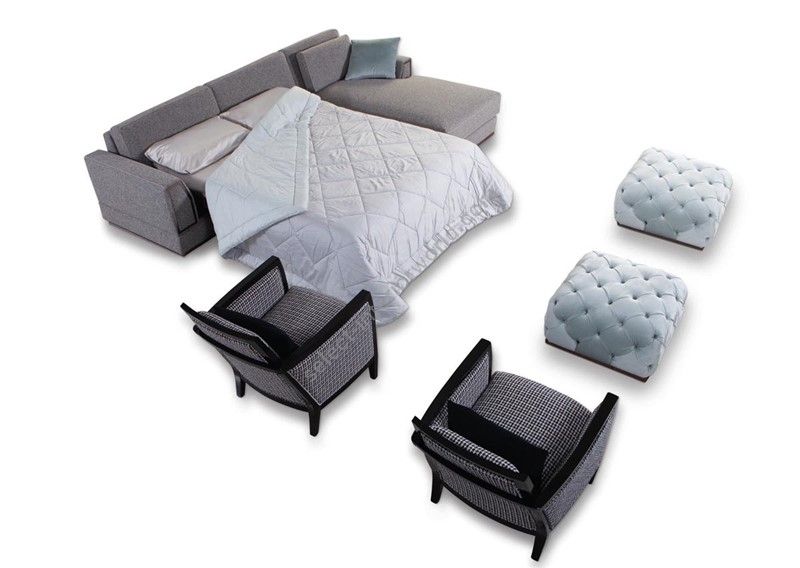 Sofa with a partially removable covering in fabric version. Structure in fir wood and poplar multi-layer. Padding made from non-deformable polyurethane foam with different levels of density. Seat cushion with springs and SOFTSYSTEM technology . The base and the steel front panels are standard. Instead, for different metal finishes, please consider the increase according a price list. This model is available with bed mechanism , with mattress of 11 cm in non-deformable high-density polyurethane , covered with a removable and washable lining with aloe treatment. The quilted parts should be considered as an accessory and increased according a price list.