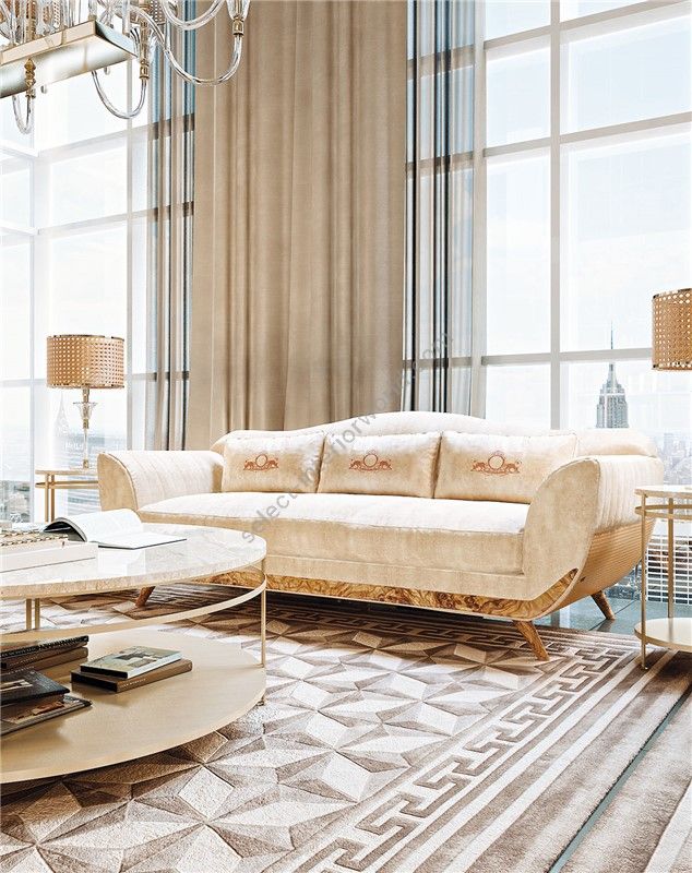 Partially uncoverable sofa. Frame made of ash-wood and multilayered poplar-wood that may be inspected by undoing the zipper underneath the sofa. Variable density polyurethane foam padding, down-feather seat cushions with a system of reversible super-soft springs. The down-feather cushions on the sofa are standard . The front and feet are made of birchwoodburl and ash-wood. The cane-work on the sides of the armrests are standard.