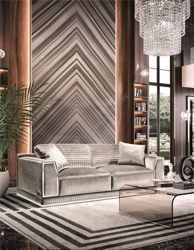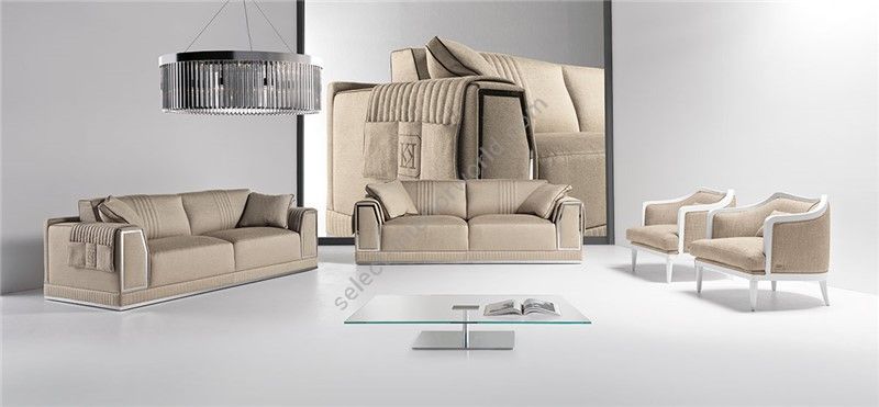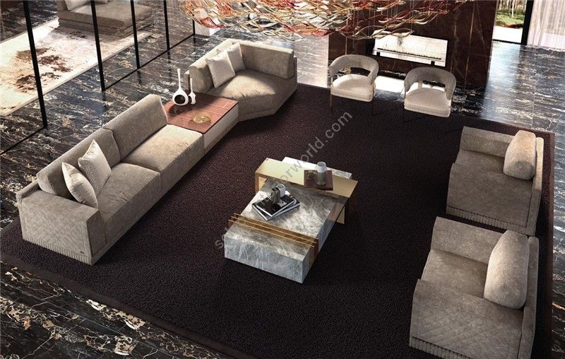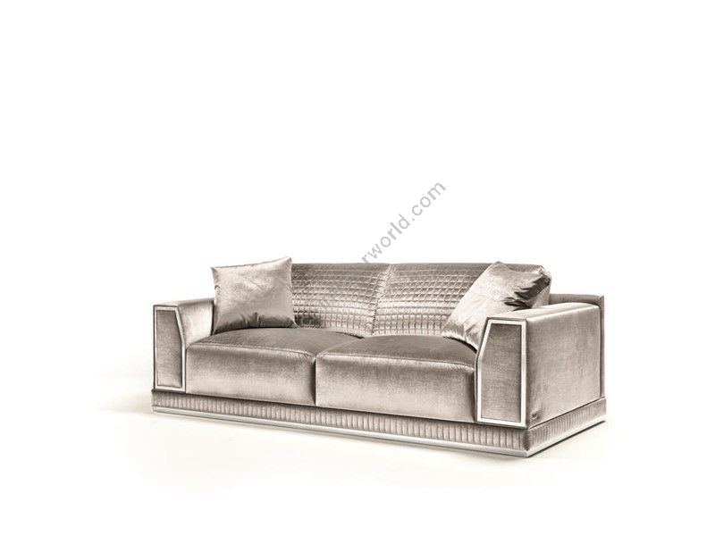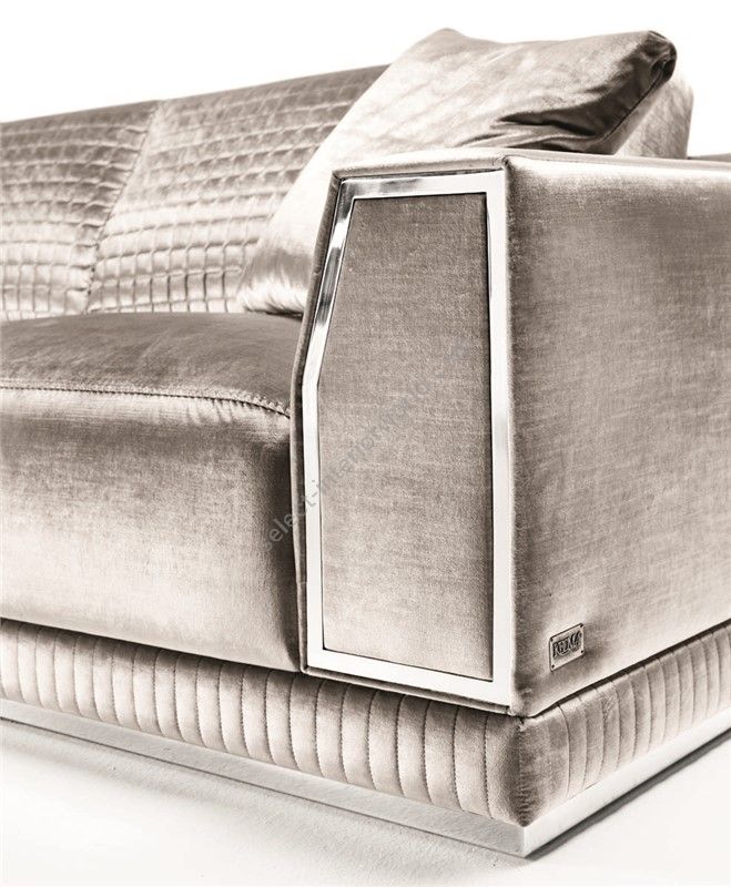 Sofa with partially removable coverings, in fabric and leather versions. Fir wood frame and poplar plywood can be inspected with a zip underneath the sofa. Non-deformable expanded polyurethane padding in different densities, seat cushion with SOFT SYSTEM type springs. The steel base and front metal inserts are standard. Instead, for particular finishes, please consider the increase according a price list. Backrest quilting can be ordered on request with an extra charge. Standard back cushions are padded with goose feathers.