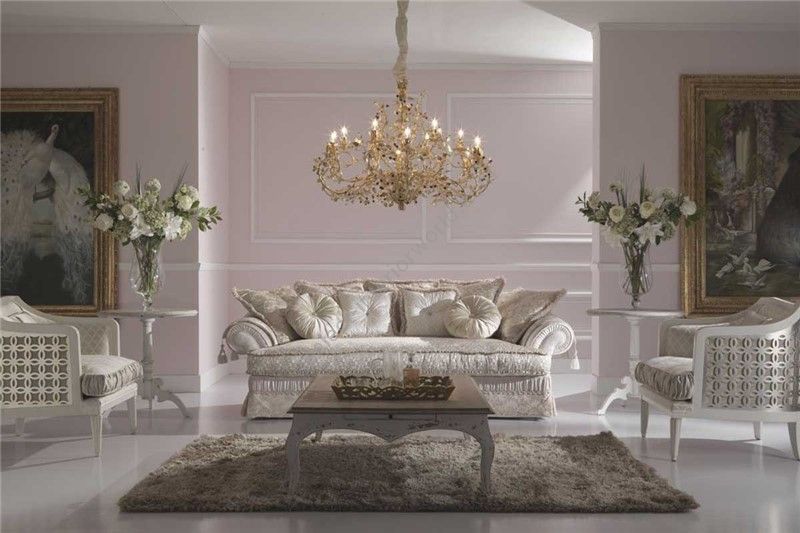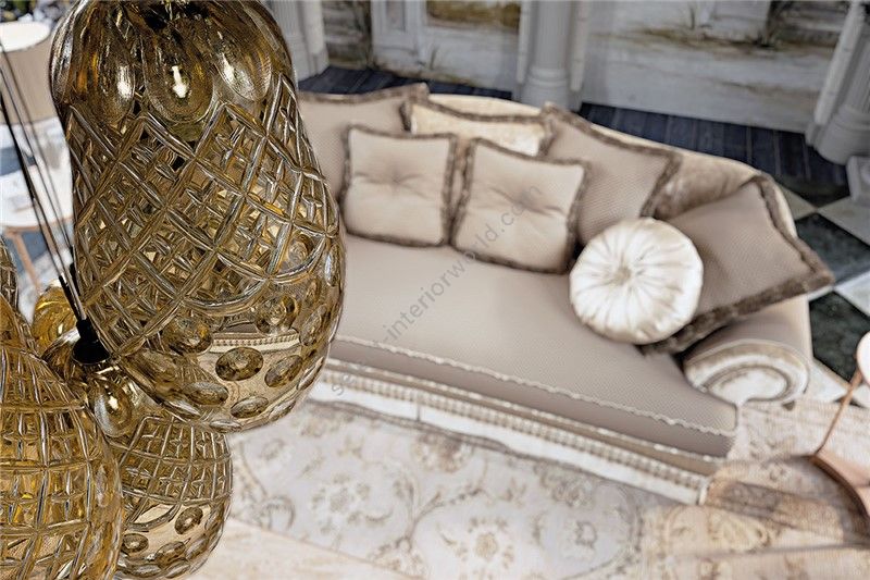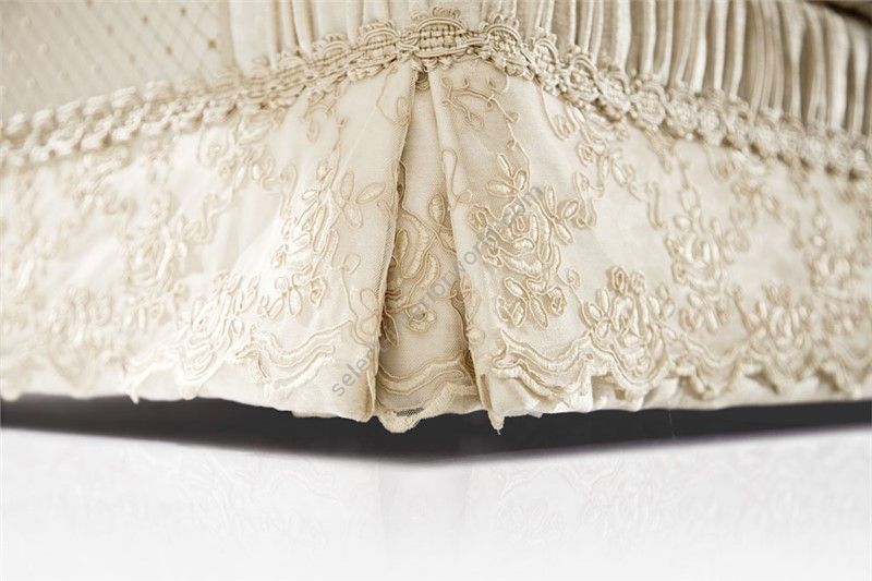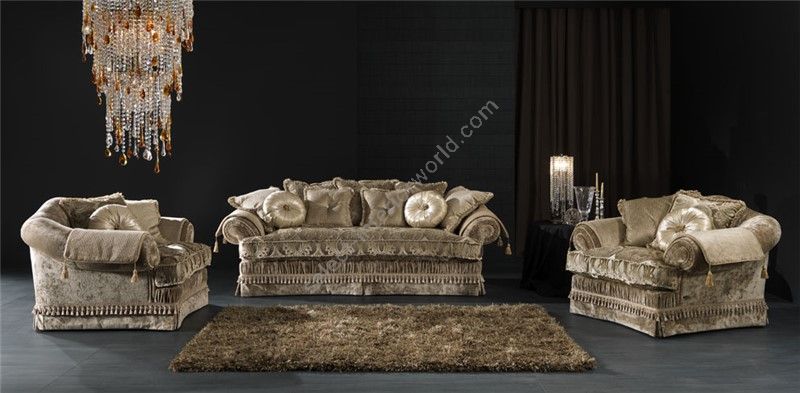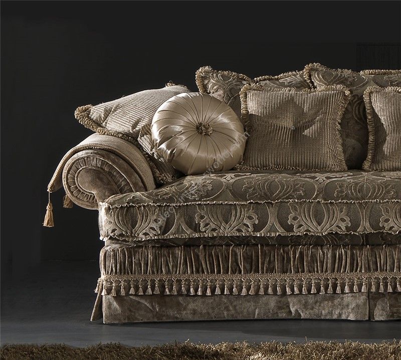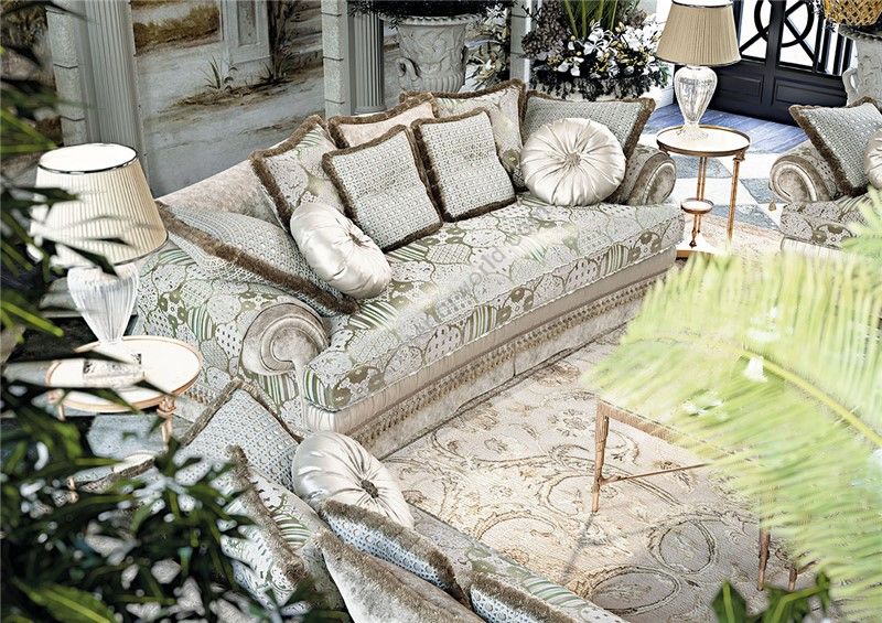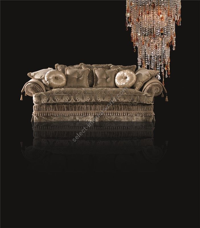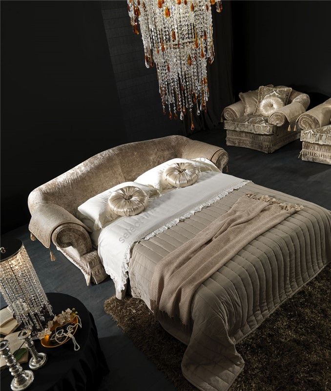 Sofa with a partially removable cover. The frame is made of firwood and poplar multilayer , and can be inspected by opening a zip positionated under the sofa. Not deformable polyuretahne padding with different densities. Reversible seat cushions with down filling, springs and SUPER-SOFT-SYSTEM. The cushion on top, the metal-acrylic trimmings applied to the skirt, armrest-covers with bows are standard. Bed version avaliable with electro-welded standard support. Mattress H11 made of high-density 50 not deformable polyurethane with removable and washable Aloe shell.