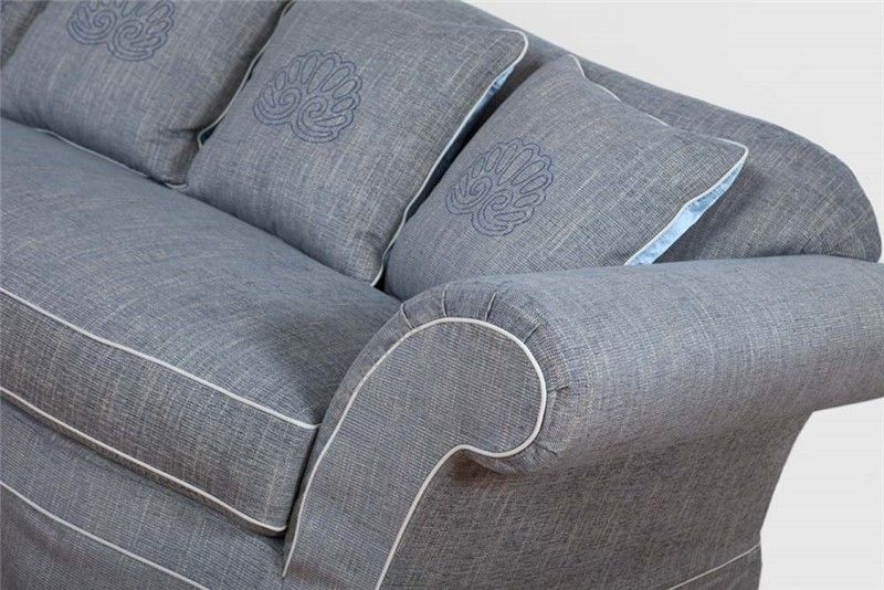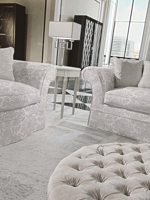 This is a completely covered sofa also inside the frame. The frame is made of fir wood and multilayer poplar which can be inspected by opening a zip positioned underneath the sofa. The non-deformable polyurethane expanse padding is at differentiated quotas and there are down reversible seat cushions with SUPER-SOFT-SYSTEM springs. The down cushions on top are standard. On request you can have finishing with classic cording, gross-grain, brushing, bordering or pleating with the same fabric. The feet are made of walnut dyed beech wood. Other colours are available on request. The pleated skirt is only on request. Available as a sofa bed fitted with a two-fold action mesh base. Orthopaedic or electrowelded bases are available upon request. 12 cm high sprung mattres.