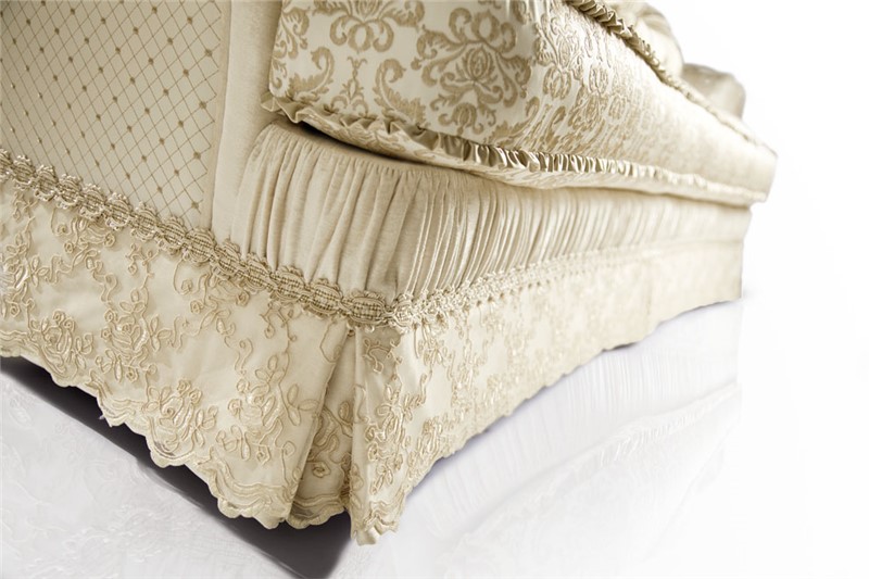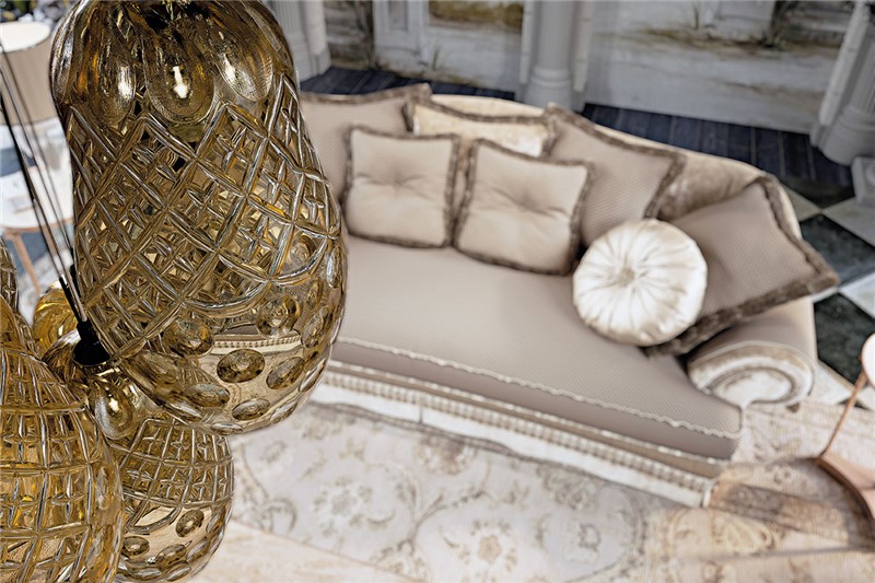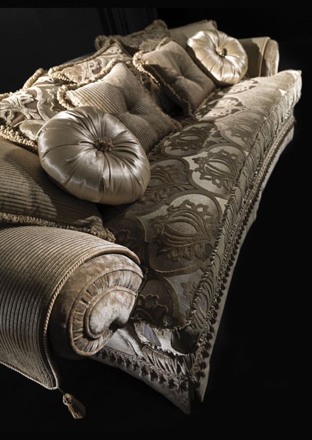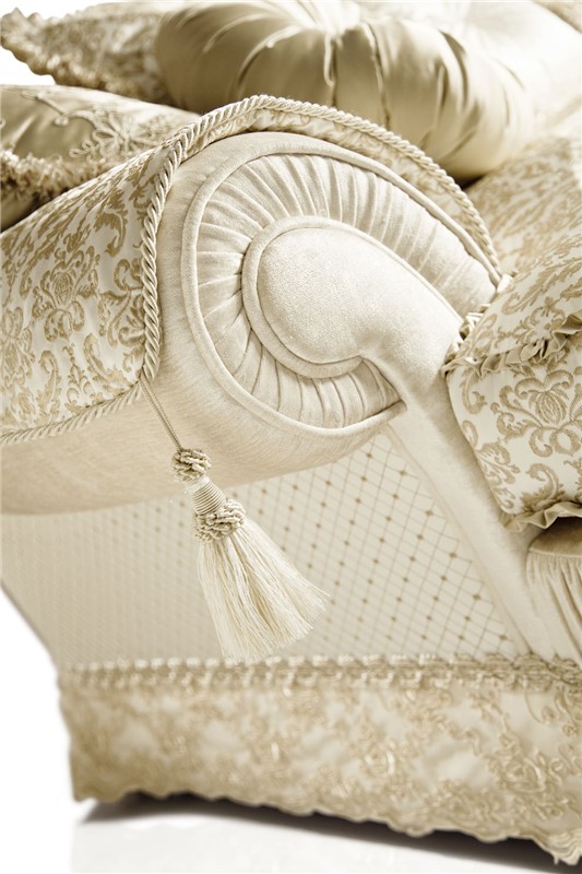 Sofa with a partially removable cover. The frame is made of firwood and poplar multilayer , and can be inspected by opening a zip positionated under the sofa. Not deformable polyuretahne padding with different densities. Reversible seat cushions with down filling, springs and SUPER-SOFT-SYSTEM. The cushion on top, the metal-acrylic trimmings applied to the skirt, armrest-covers with bows are standard. Bed version avaliable with electro-welded standard support. Mattress H11 made of high-density 50 not deformable polyurethane with removable and washable Aloe shell.