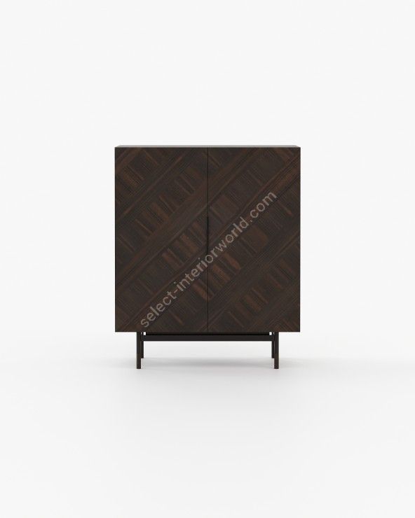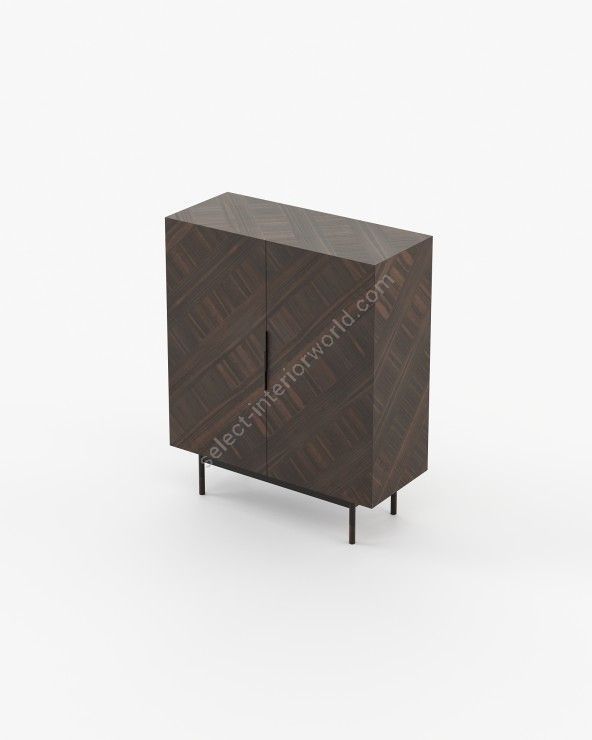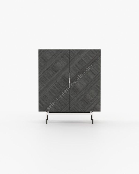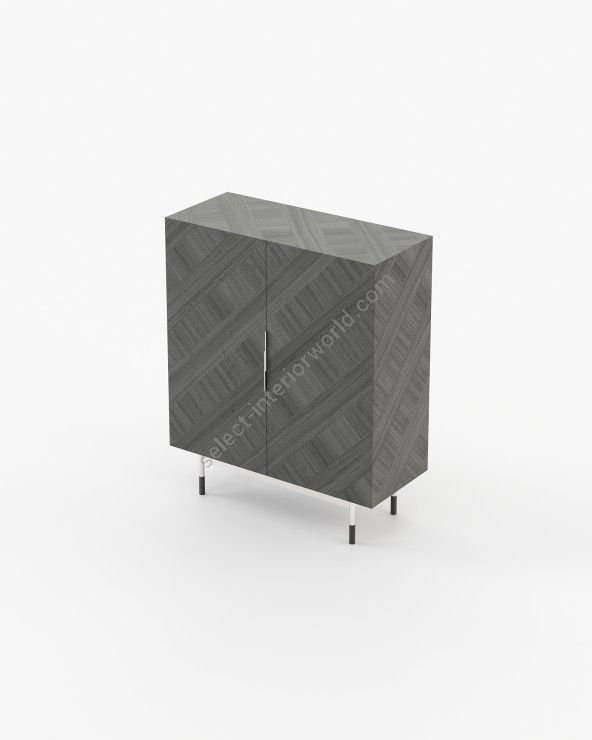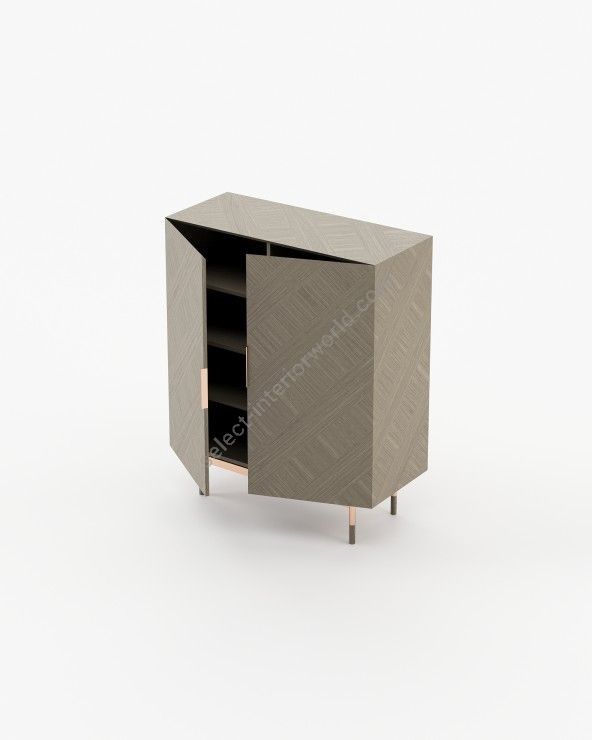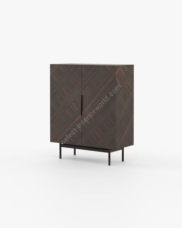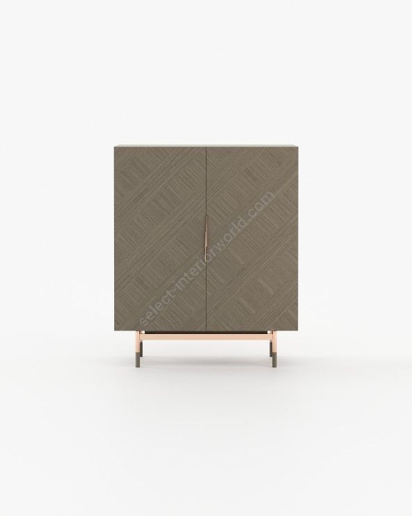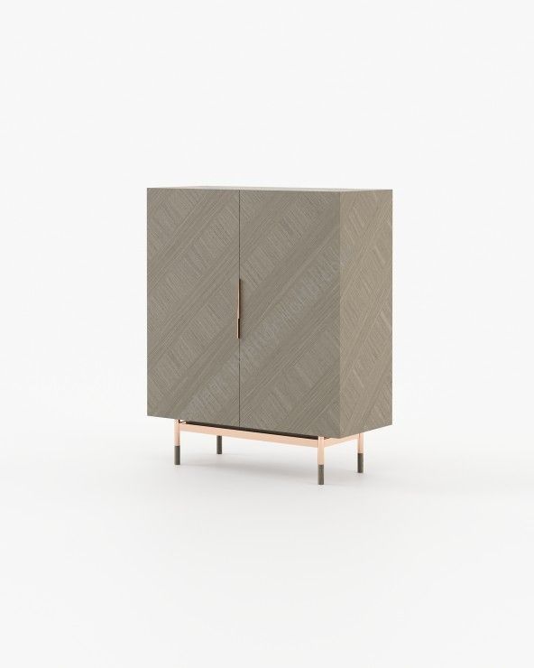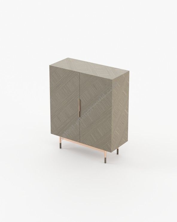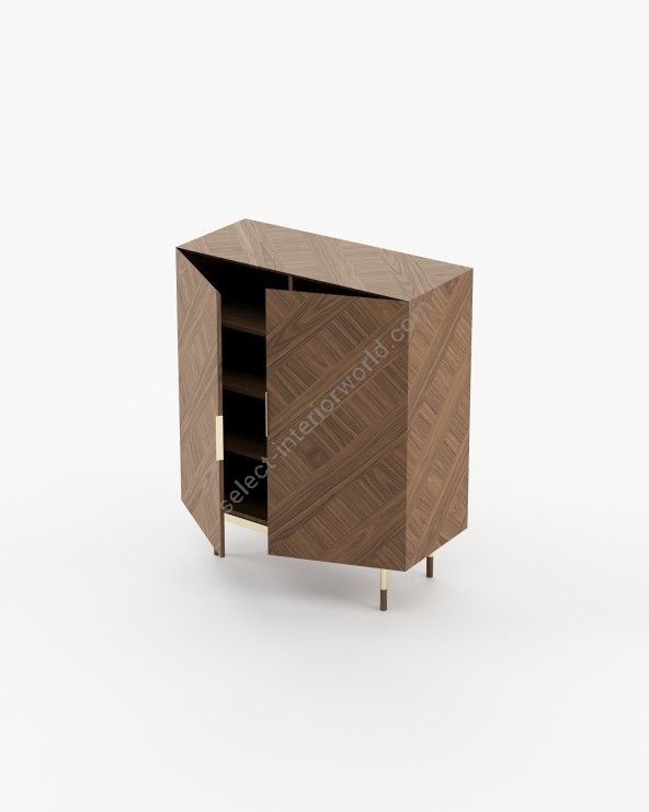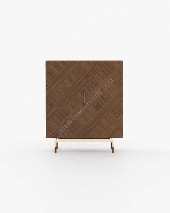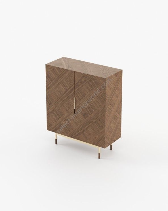Claud cupboard is ideal for storing glassware or exclusive liquors. This vintage style cabinet features a gold structure and two doors with metal handles. This extremely versatile cabinet has a striking geometric wood body, perfect to any living or dining room.