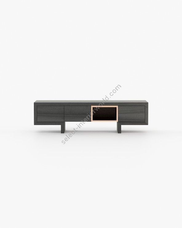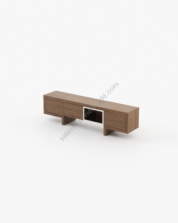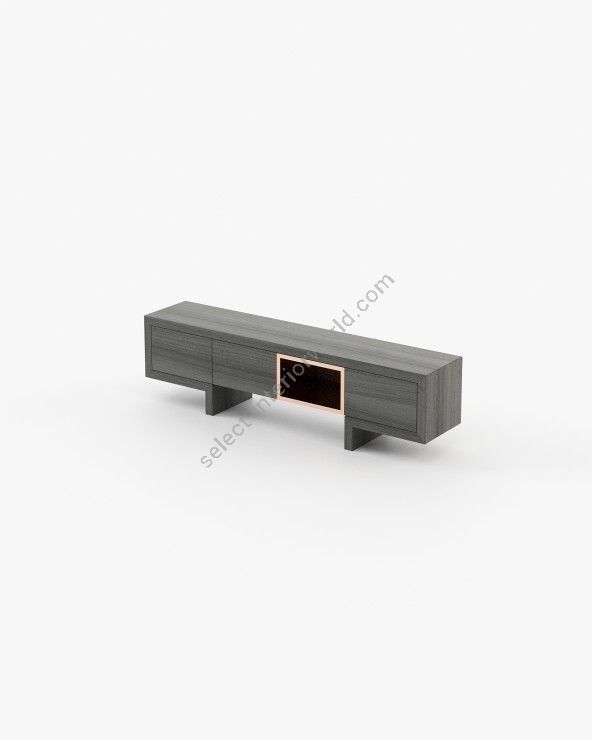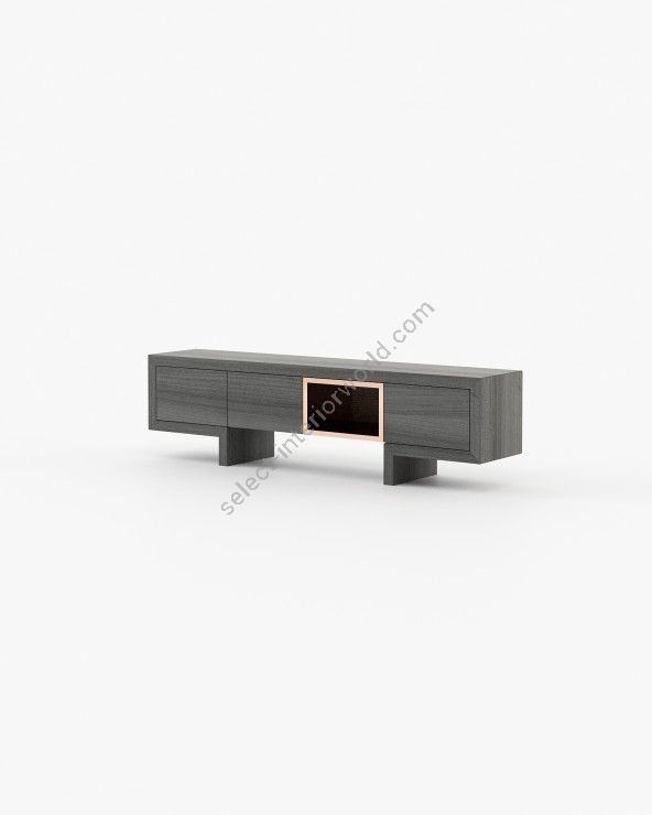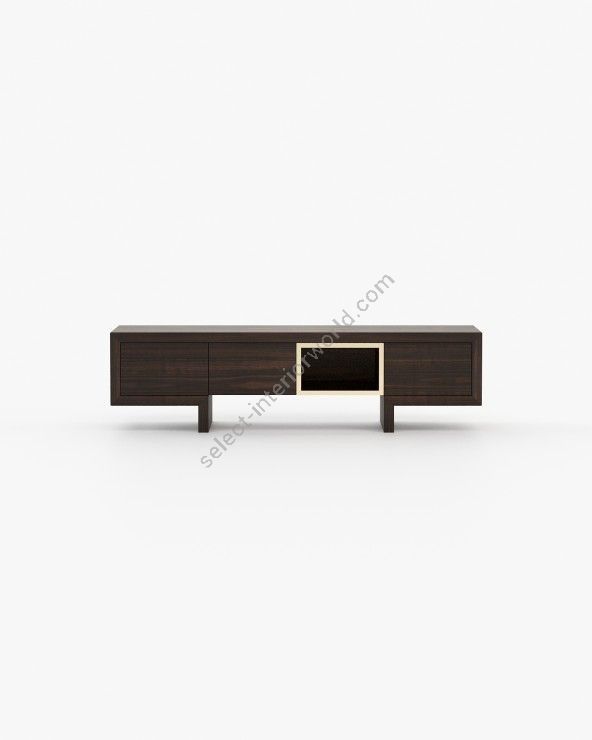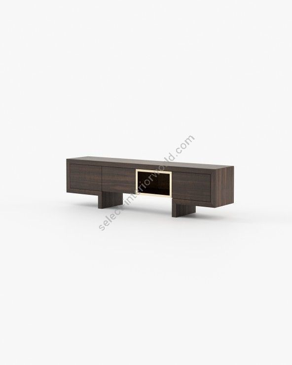 The Isis TV cabinet is a modern piece inspired by contemporary decor trends, handmade by Laskasas artisans and featuring a sleek silhouette with three doors in walnut veneer and a shelf with golden details.
