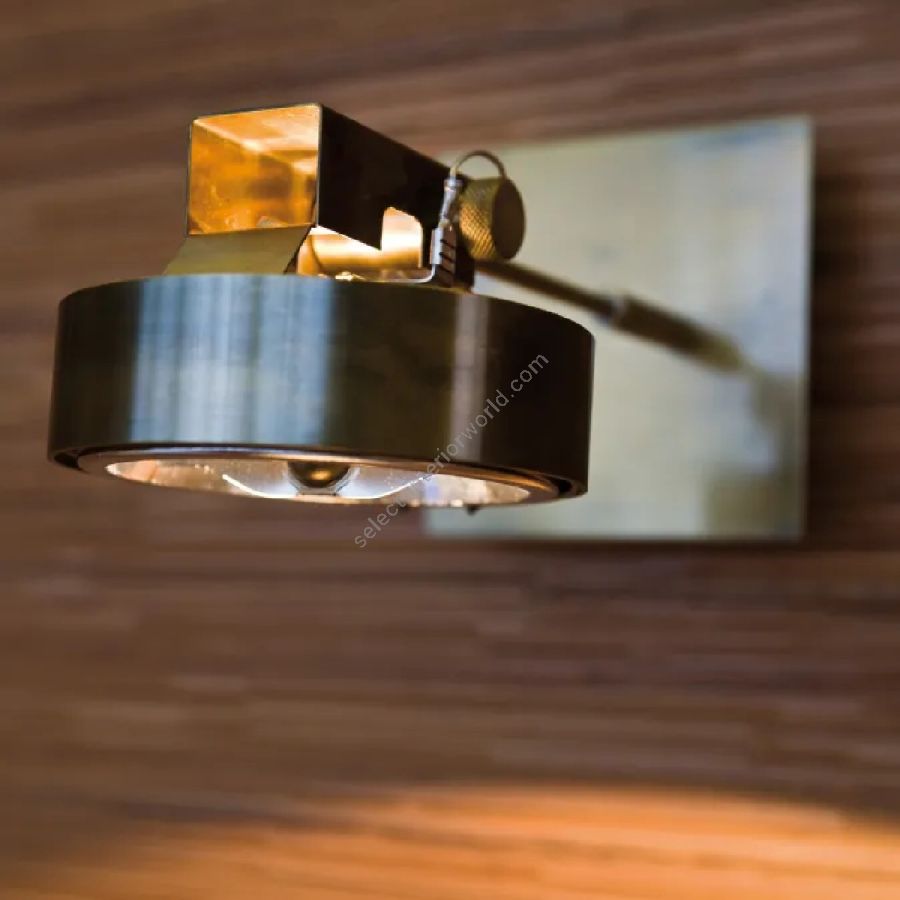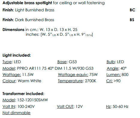 Adjustable spotlight in burnished brass designed for ceiling or wall fixing. Available in light or dark burnished brass.