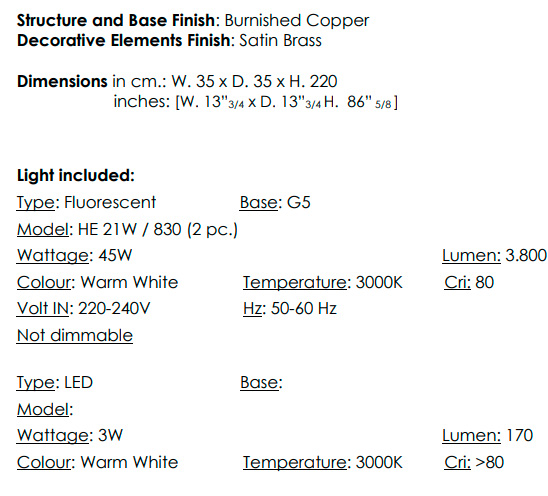 Floor lamp with burnished copper structure and decorative elements in satin brass.