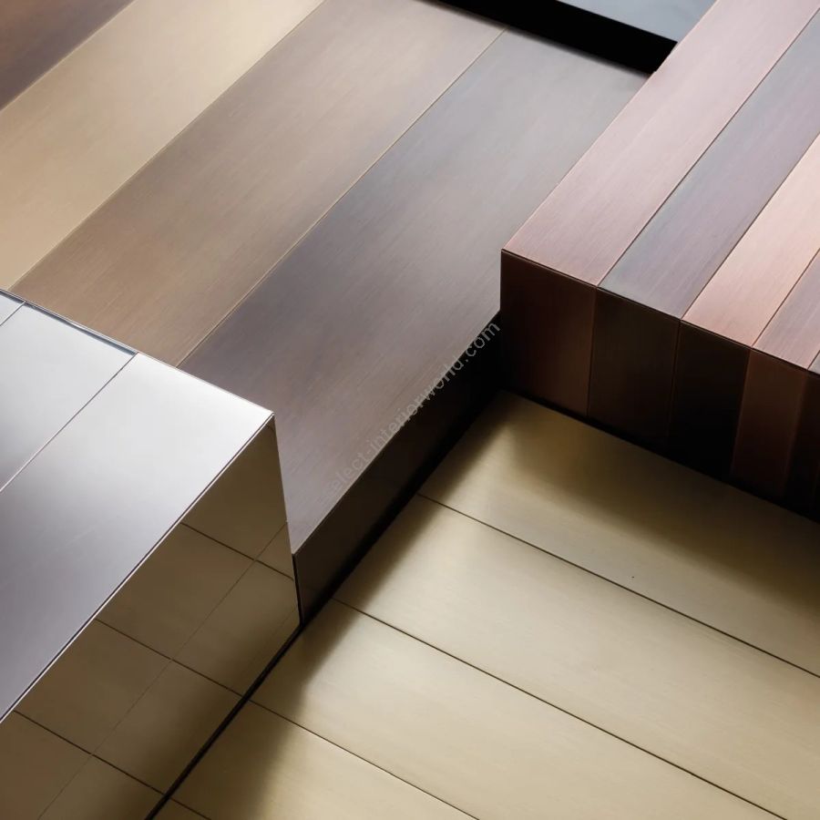 Family of tables entirely covered in a sequence of metal bands, available in various shapes and sizes.