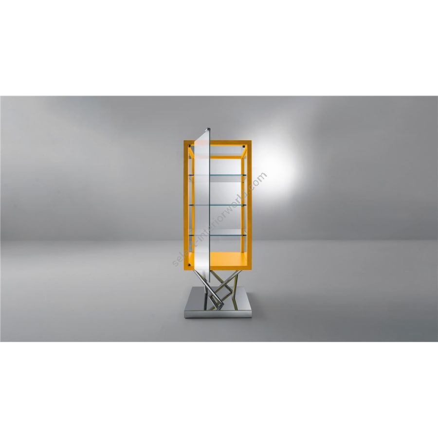 Tall cabinet with steel base, structure in yellow aniline-dyed maple, structure, shelves and hinged door in extra-clear crystal.