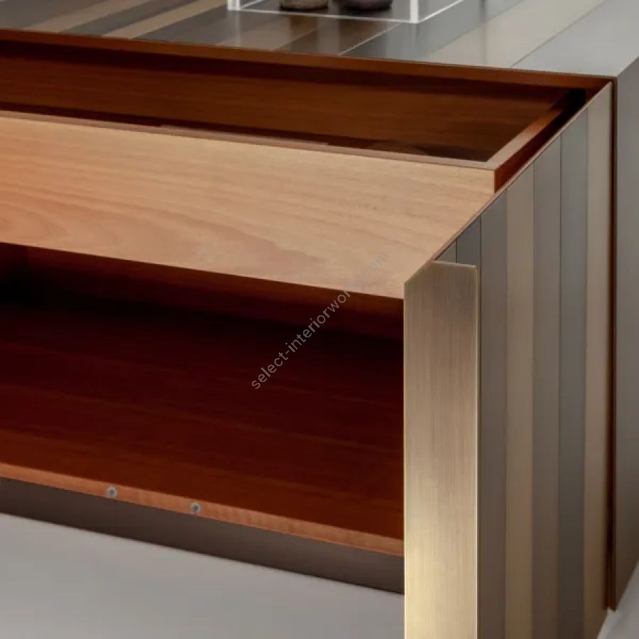Sideboard with hinged doors and structure covered in a sequence of metal strips. Equipped with two internal drawers. Interior in walnut Colore and metal plinth.