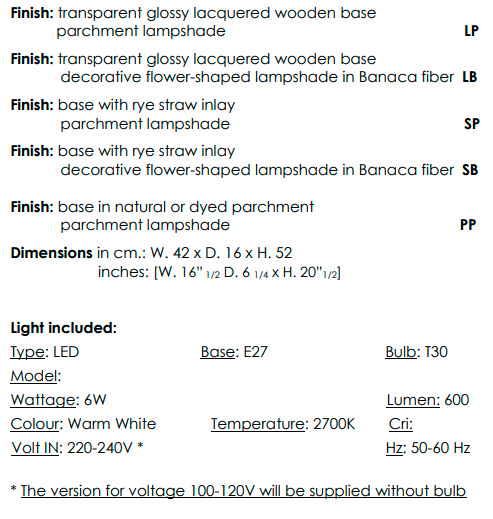 Table lamp with base in transparent glossy stained wood or decorated with a rye straw inlay.