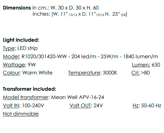 | Dimensions (HxWxD): | cm: 60x30x30 / inch: 23.62"x11.81"x11.81" |