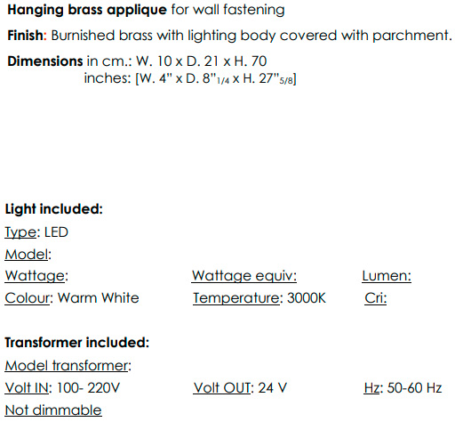 Wall lamp composed of a luminous element in burnished brass and goat parchment.