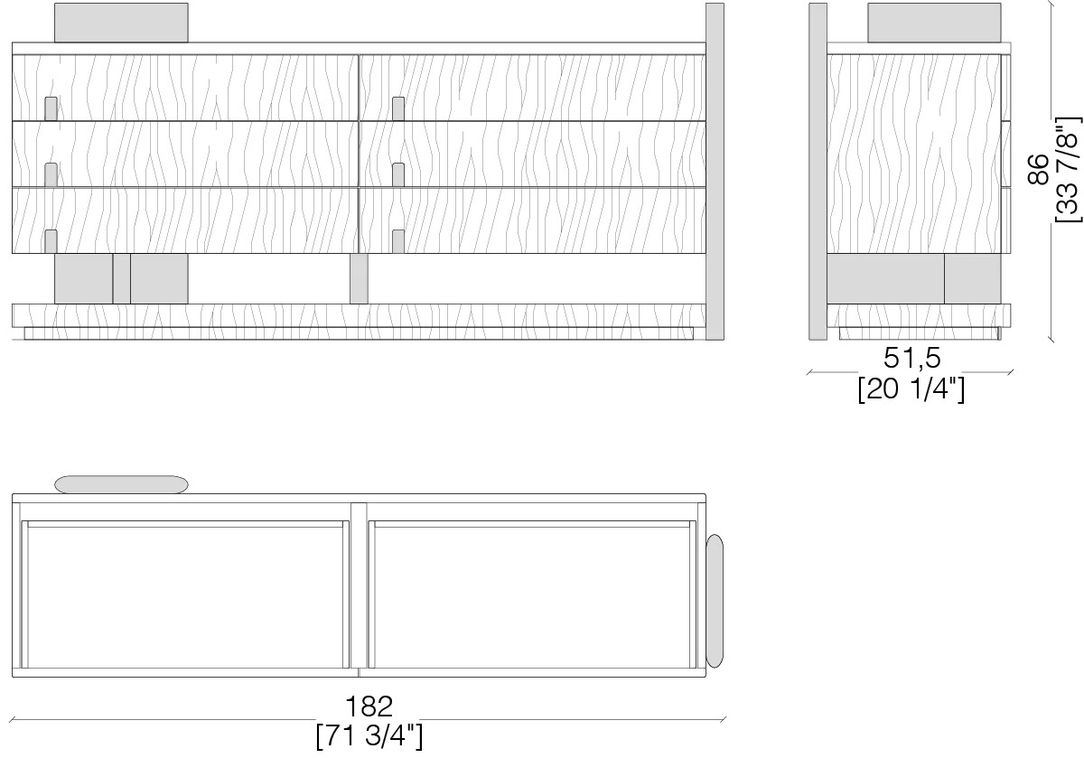 Structure and drawers in Termocotto oak, top in glossy lacquered wood, side, back and handles with bronze “Liquid Metal Raptor” finish.