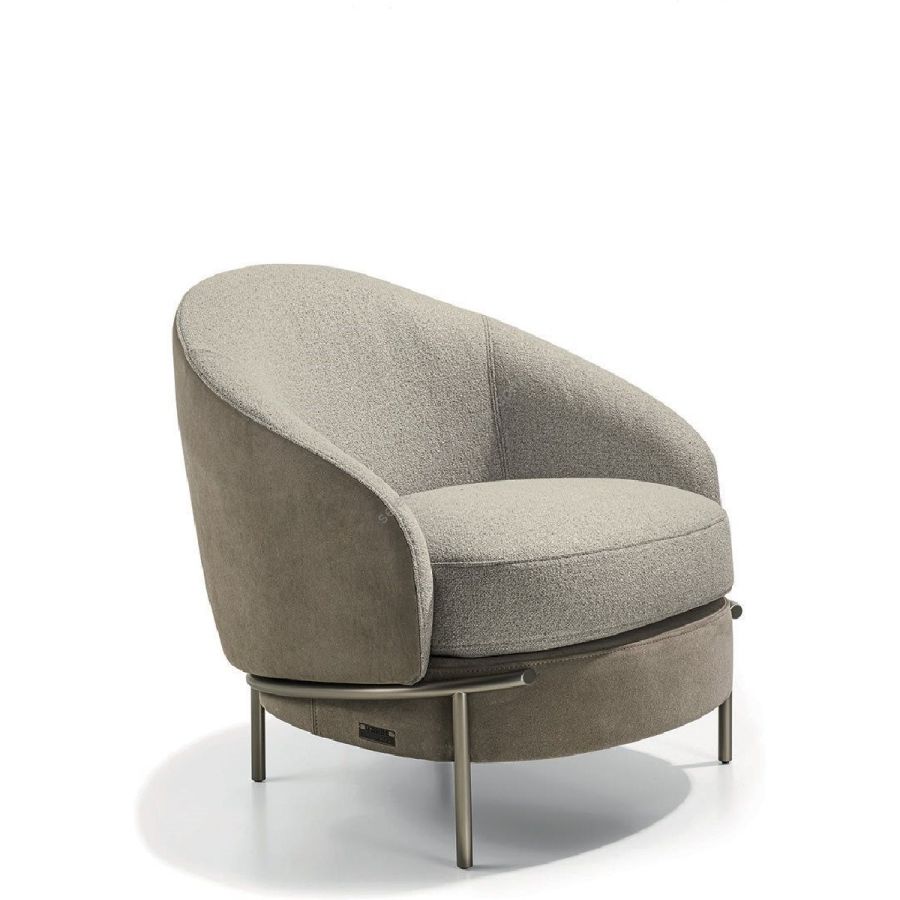 The sleek, wrap-around line of the metallic feet is highlighted by the soft curve of the armrest. Vintage in flavour, the overall shape is given a contemporary twist by the use of extremely sophisticated fabric or leather upholstery, both for the seat cushions and for the outer structure, resulting in an extremely elegant mix of materials.