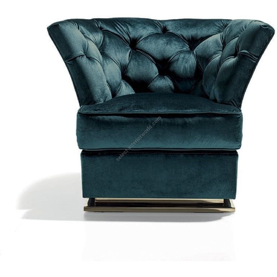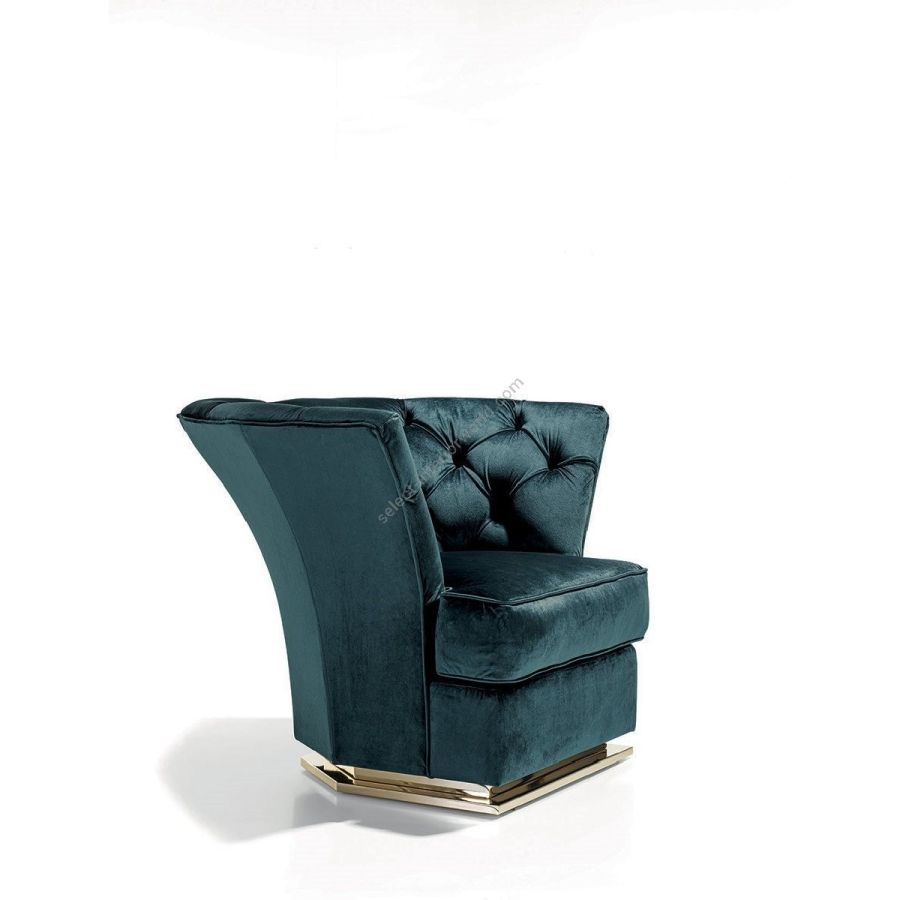 Frame in wood with elastic bands, covered in multithickness polyurethane foam. Seat cushion in sterilised goose down with insert in multi-thickness polyurethane foam. The internal cover has a “Capitonné” pattern, with buttons in plain colour. Given the special manufacturing process, fabric or leather upholstery is not removable. Metal base in the following finishes: Satin nickel, bright shaded brown, Black Rose gold, bright light gold, matt Champagne gold, bright chrome, bright black chrome, matt satin bronze, bright pink gold, matt pink gold.