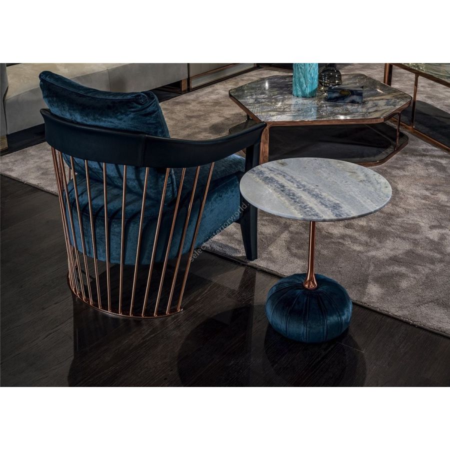 Small tables with central frame in turned metal. Frame finishes: Satin nickel, bright shaded brown, BlackRose gold, bright light gold, matt Champagne gold, bright chrome, bright black chrome, matt satin bronze, bright pink gold, matt pink gold. Top surface finish: as the structure, hand engraved cast brass, glossy/matt Maple, glossy/matt heat-treated Eucalyptus, glossy/matt Sycamore frisè, glossy/matt Ebony, glossy/matt Canaletto walnut, glossy walnut burl wood, Portoro marble, Azul Macauba marble, Sahara Noir marble (polyesterfinish), Dover White marble, Panda White marble, Guatemala Green marble, Corteccia marble, Port Saint Laurent marble, Red Levanto marble, Bardiglio Nuvolato marble, Elegant Brown marble, Shale Rose wood marble, Emperador Dark marble, Silver Wave marble, Agatha Black marble, Frappuccino marble, Calacatta marble, Fusion Light marble, Patagonia marble, Explosion Blu marble, Fusion Multicolor marble, Juliet quartz marble, Calcite Azul marble, Azul Macauba marble, Portoro marble, Red onyx. The base hasa wood and metal structure covered in high density polyurethane foam. It is covered in leather or in fabric from the catalogue. Available with tufted “Capitonné” stitching with plain coloured buttons or Swarovski crystal buttons, or with radiating folds around the circumference. Covers are not removable.