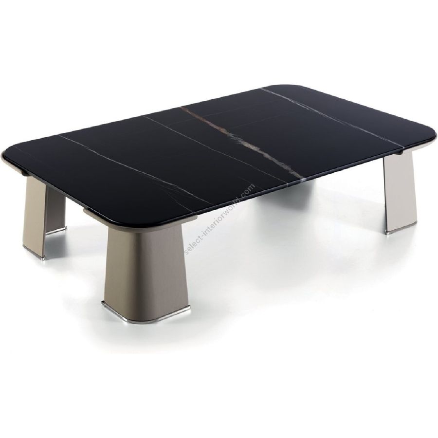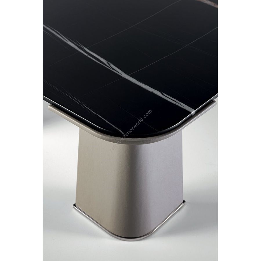 Service table with 4 foam-covered legs upholstered externally in leather from the catalogue and internally covered by curved metal sheet in the finishes: Satin nickel, Bright shaded brown, Black Rose gold, bright light gold, matt Champagne gold, bright chrome, bright black chrome, matt satin bronze, bright pink gold, matt pink gold.To complete the leg, the base is enhanced with a metal foot in the same finish as the curved plate.The top is in marble 20 mm with double bullnose: White Carrara marble, Imperial Brown marble, Azul Macauba marble, Sahara Noir marble (glossy and matt polyester finish), Dover White marble, Panda White marble, Guatemala Green marble, Corteccia marble, Port Saint Laurent marble, Red Levanto marble,- BardiglioNuvolato marble, Elegant Brown marble, Shale Rosewood marble, Emperador Dark marble, Silver Wave marble, Agatha Black marble, Frappuccino marble, Calacatta marble, Fusion Light marble, Patagonia marble, Explosion Blue marble, Fusion Multicolor marble, Juliet Quartz marble, Portoro marble.