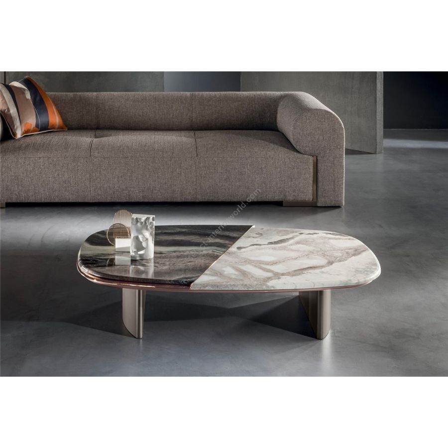 Small oval table with 2 curved wooden legs lacquered in colours from the catalogue, including the exclusive“Quartz” and “Lilac grey”. The top consists of two portions in sectioned marble, positioned irregularly, with 20 mm bevelled joint: Travertino, Silver Beola, Cipollino marble, Arabescato Orobico marble, SilverStream marble, White Carrara marble, Imperial Brown marble, Elegant Brown marble, Sahara Noir marble(polyester finish), Dover White marble, Guatemala Green marble, Red Levanto marble, Shale Rosewood marble, Emperador Dark marble, Silver Wave marble, Agatha Black marble, Frappuccino marble, Calacatta marble, Patagonia marble, Juliet Quartz marble. The two portions must be the same finish, or if requested, they can be two different marbles. The under top part is in lacquered wood, and along the perimeter, it is covered with a metallic profile in the finishes: Satined champagne, Bright/satined Burnished, Shaded copper, Bright/satined brown, Bright/satined Black rose, Bright/satined light gold, Bright/satined chrome,Bright/satined black chrome, Matt satined bronze.