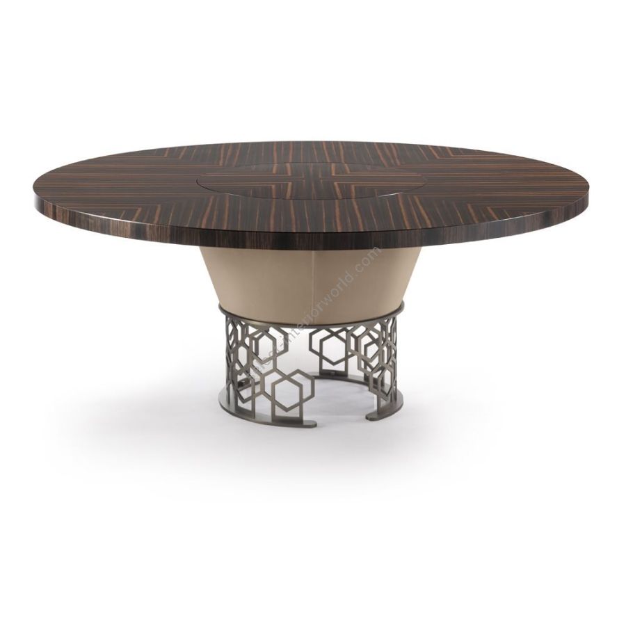 The collection of Claimont dining tables stands out for the surprising combination of materials and finishes, which combine to produce sophisticated new tastes. The structure consists of a shell and undertop, rigorously covered in leather, and a base that sets on the floor in ground metal with the “Sequence” decoration. The top comes in marble, glass or wood, and can be oval or round. The round version also offers a lazy Susan that renders it more practical and efficient.
