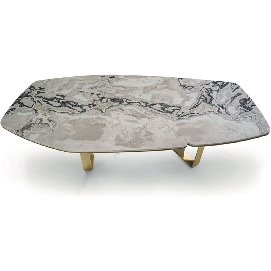 Table consisting of 2 trapezoidal legs and a shaped and sectioned top made of different materials. Machined and laser cut ground metal base in the finishes: Satin nickel, Bright shaded brown, Black Rose gold, bright light gold, matt Champagne gold, bright chrome, bright black chrome, matt satin bronze, bright pink gold, matt pink gold. The leg insert is covered in leather from the catalogue or in wood: glossy/matt Maple, glossy/matt heat-treated Eucalyptus, glossy/matt ebony, Canaletto walnut stained gloss/matt Macadamia, glossy/matt Sycamore frisè. Under-top covered in leather from the catalogue, if desired, matching the leginsert. The top, divided into 2 or 3 parts, is in the finishes: White Carrara marble, Imperial Brown marble,Sahara Noir marble (glossy and matt polyester finish), Dover White marble, Panda White marble, GuatemalaGreen marble, Corteccia marble, Port Saint Laurent marble, Red Levanto marble, Bardiglio Nuvolato marble,Elegant Brown marble, Shale Rosewood marble, Emperador Dark marble, Silver Wave marble, AgathaBlack marble, Frappuccino marble, Calacatta marble, Fusion Light marble, Patagonia marble, ExplosionBlue marble, Fusion Multicolor marble, Juliet Quartz marbl, .or in wood: glossy/matt Maple, glossy/mattheat-treated Eucalyptus, glossy/matt Sycamore frisè, glossy/matt ebony, Canaletto walnut stained gloss/matt Macadamia.