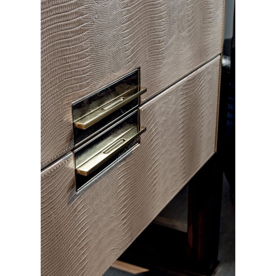 Make-up dresser with 2 drawers and functional storage area for cosmetics or jewellery. Base and top in wood finishes: glossy lacquered wood in range colours, glossy/matt ebony, glossy/matt Canaletto walnut, glossy/matt Sycamore frisè. Sides and drawer fronts upholstered in leathers from the catalogue. The interior of the cosmetic container is covered in P.3 Cat. Suede leather and the flap door closure is equipped with a mirror with metal edges.Ground metal base profile and frame in the following finishes: bright shaded brown, bright light gold, matt Champagne gold, bright chrome, bright black chrome, matt satin bronze, bright pink gold, matt pink gold, Black Rose gold. Handle with marble insert (marble from the range).