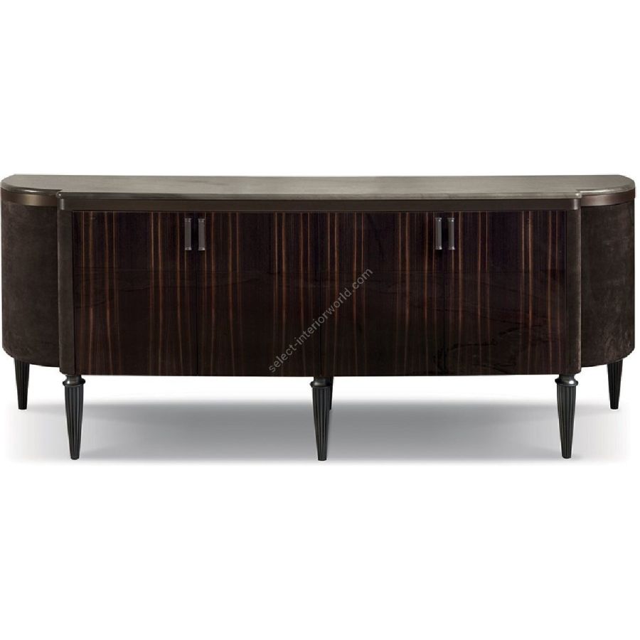 Low cabinet with wood structure in the finishes: glossy/matt Maple, glossy/matt heat-treated Eucalyptus, glossy/matt ebony, glossy/matt Canaletto walnut, glossy/matt Sycamore frisè. Curved sides covered in leather as in our sample set. Shaped top in the finishes: matt ebony with inlay, Marble 20 mm thickness with half-bullnose rounded edge: White Carrara marble, Imperial Brown marble, Sahara Noir marble (polyester finish), Dover White marble, Panda White marble, Guatemala Green marble, Corteccia marble, Port SaintLaurent marble, Red Levanto marble, Bardiglio Nuvolato marble, Elegant Brown marble, Shale Rosewood marble, Emperador Dark marble, Silver Wave marble, Agatha Black marble, Frappuccino marble, Calacatta marble, Fusion Light marble, Patagonia marble, Explosion Blu marble, Fusion Multicolor marble, Juliet quartz marble. Edge in metal in the same finish as the legs or covered in leather as in our sample set. Legs in metal in the finishes: Satin nickel, bright shaded brown, bright light gold, matt Champagne gold, bright chrome, bright black chrome, matt satin bronze, bright pink gold, matt pink gold, Black Rose gold. Grooved metal handles.