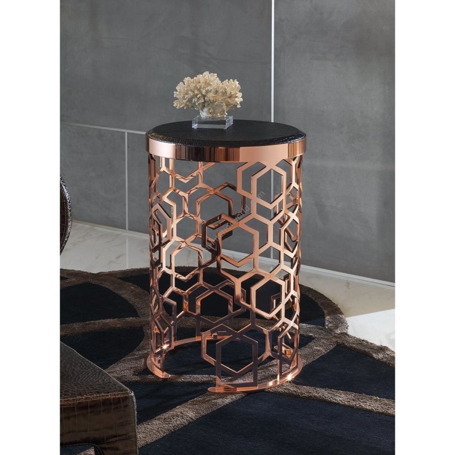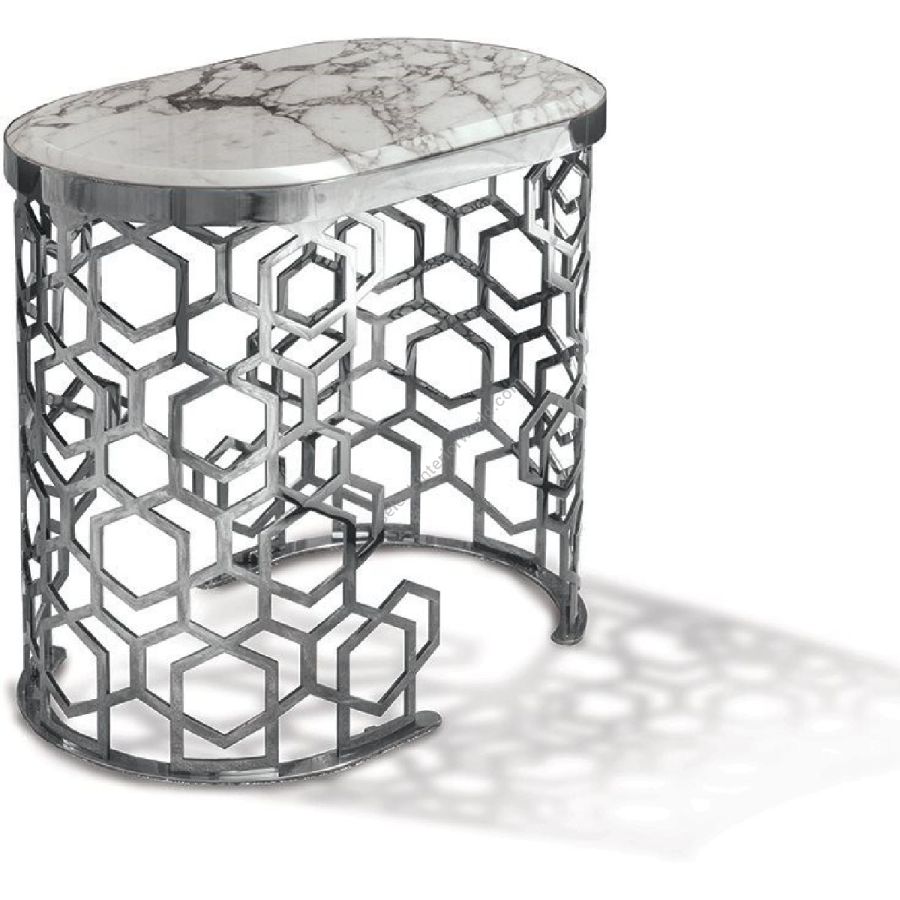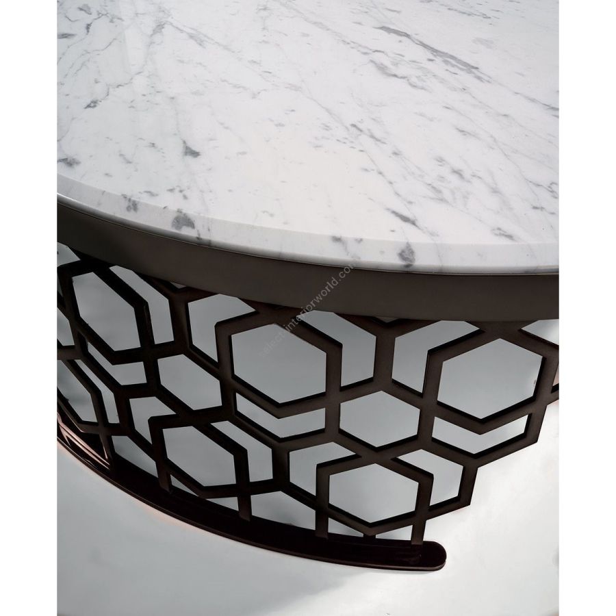 Small table with base formed from ground laser-cut metal with a curved “Sequence” decoration. Structure finish: Satin nickel, bright shaded brown, Black Rose gold, bright light gold, matt Champagne gold, bright chrome, bright black chrome, matt satin bronze, bright pink gold, matt pink gold. Top finish: White Carrara marble, Imperial Brown marble, Sahara Noir marble (glossy and matt polyester finish), Dover White marble, Panda White marble, Guatemala Green marble, Corteccia marble, Port Saint Laurent marble, Red Levanto marble, Bardiglio Nuvolato marble, Elegant Brown marble, Shale Rosewood marble, Emperador Dark marble, Silver Wave marble, Agatha Black marble, Frappuccino marble, Calacatta marble, Fusion Light marble, Patagonia marble, Explosion Blue marble, Fusion Multicolor marble, Juliet Quartz marble, Calcite Azul marble, Azul Macauba marble, Portoro marble.