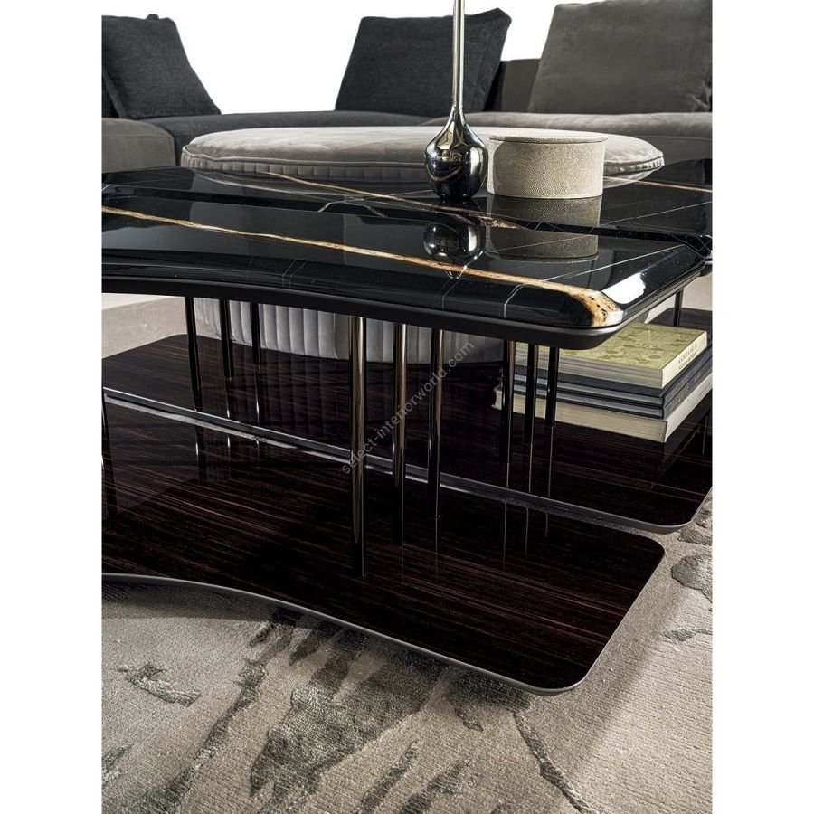 Small table with 50 cm radius concave compartment to accommodate a pouf or other accessories. The surface at the base is in wood: glossy/matt Maple, glossy/matt heat-treated Eucalyptus, glossy/matt ebony, Canaletto walnut stained glossy/matt Macadamia, glossy/matt Sycamore frisè, glossy lacquered wood in range colours. The top surface is the finishes: bronze or smoky mirror 5 mm with bevel. 20mm marble with20mm bevel: White Carrara marble, Imperial Brown marble, Sahara Noir marble (glossy and matt polyester finish), Dover White marble, Panda White marble, Guatemala Green marble, Corteccia marble, Port Saint Laurent marble, Red Levanto marble, Bardiglio Nuvolato marble, Elegant Brown marble, Shale Rosewood marble, Emperador Dark marble, Silver Wave marble, Agatha Black marble, Frappuccino marble, Calacatta marble, Fusion Light marble, Patagonia marble, Explosion Blue marble, Fusion Multicolor marble, Juliet Quartz marble, Azul Macauba marble, Red onyx, Ivory onyx, white onyx. The top is supported by columns Ø 14 mm in metal in the finishes: Satin nickel, bright shaded brown, Black Rose gold, bright light gold, matt Champagne gold, bright chrome, bright black chrome, matt satin bronze, bright pink gold, matt pink gold.