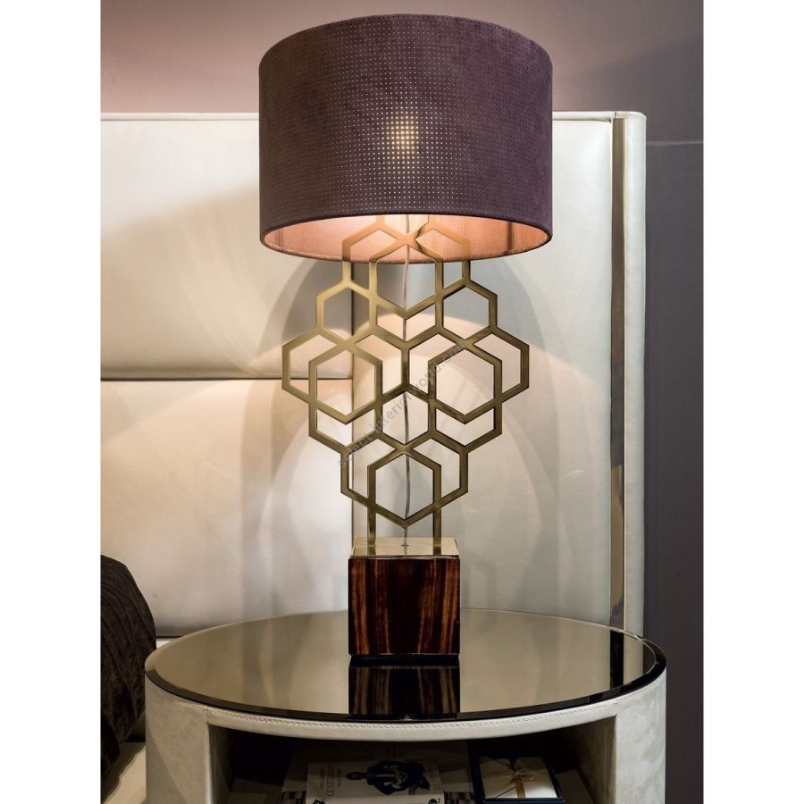 Table lamp and wall light in ground metal with laser cut “Sequence” decoration in the finishes: Black Rose gold, bright pink gold, matt pink gold, bright shaded brown, bright light gold, matt Champagne gold, bright chrome, bright black chrome, matt satined bronze. Cubic base in wood finishes: Glossy Sycamore frisè, Glossy ebony, Glossy walnut burl wood. Lamp shade in P.3 cat. Suede perforated leather, in sample colours or in satin fabric in colours white, black, beige, and red, or natural linen. Standard electrical system 230V, 50Hz - E27. Optional electrical system 120V, 60Hz - E26.