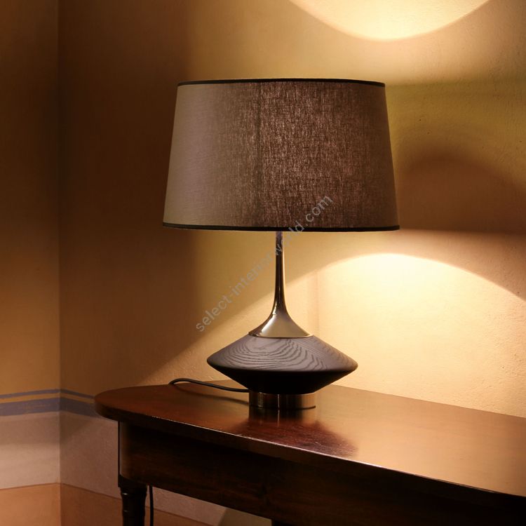 Table lamp made with different materials: brass polished nickel finish and oak wood wenge finish. Lampshade in fabric.