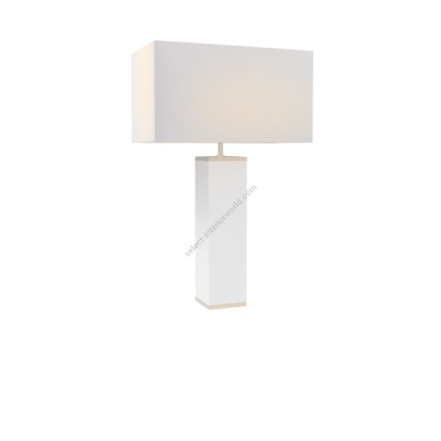 Its composition with base in lacquered wood and details in brass in gold finish and rectangular lampshade in white fabric, creates a harmony of shapes and colors that enhances the elegant and precious aesthetics. Available in various colors.