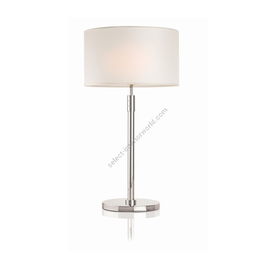Table lamp consisting of a round base, a linear body in brass with a polished nickel finish and a cylindrical lampshade in white fabric.