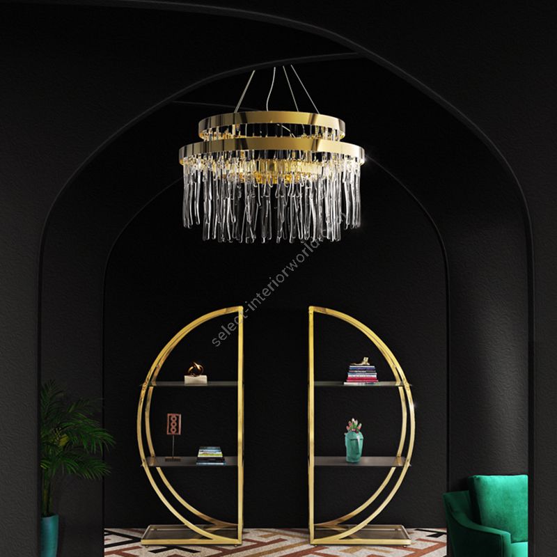 The circular gold-plated brass tiers of the Babel Suspension infuse elegance into any refined interior. Each unevenly shaped crystal glass element — crafted with artisanal mastery — creates a singular dance of light and shadow, forming an exclusive pattern of refraction. More than just a fixture, it’s an object of desire.