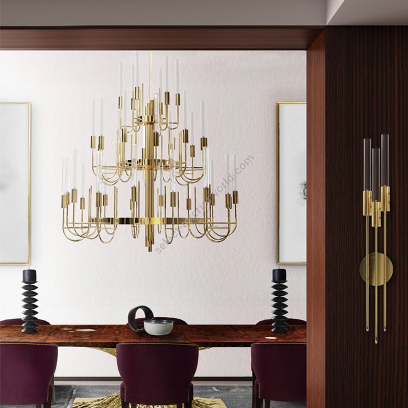 Designed from the soft blend of emotional yet beautiful lines the Gala Suspension is the perfect outcome of brass and crystal glass. A superb piece for timeless creations.