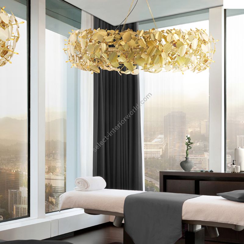 Strengthening the experimentalism in this new design of McQueen’s collection, the approaches to the epitome of contemporary luxury are kept in the tradition of the jewelry artisans. Each sheet is made of hammered brass with gold plated ending and a rhythmic luminosity of the Swarovski crystals. Bring up a savage mind to a perfect lighting solution for common areas like dining rooms or in a hotel lobby.