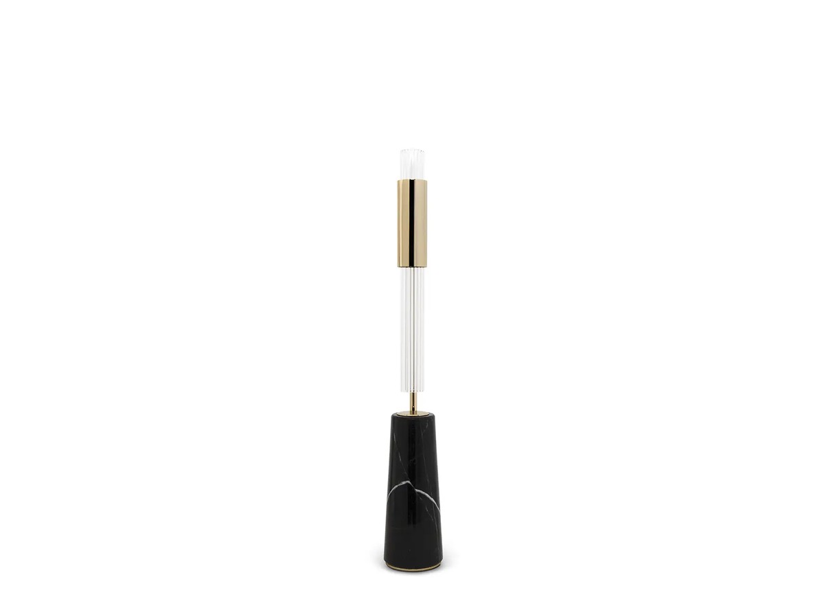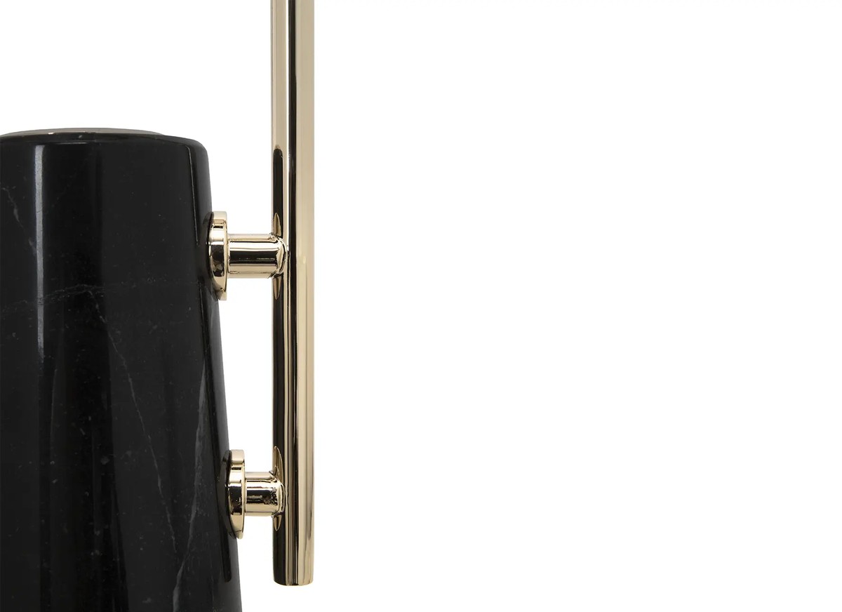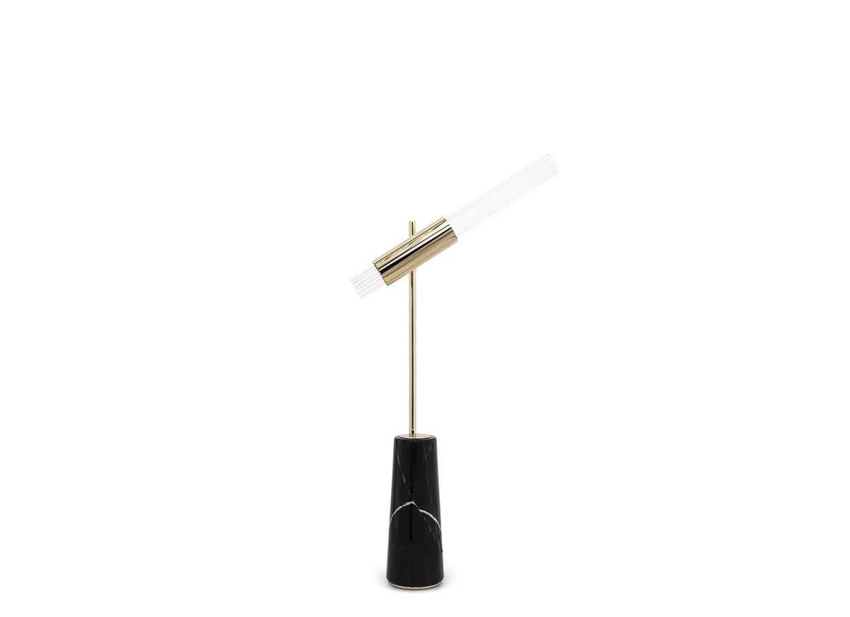 Just like telescopes were an innovation, the Gamma Table Lamp is a new take on adjustable table lamps. Thanks to its rotating arm, its light can be directed, making it the ideal choice for a desk or nightstand. A modern table lamp featuring a marble base, crystal glass, and a gold-plated brass body.
