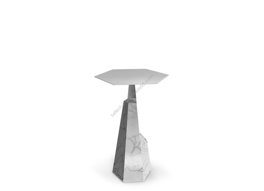 Myllo’s architectural allure is undeniable, as its design was inspired by the ambiguity of astounding structures worldwide. The Myllo side table is made with a series of timeless materials displayed in a towering manner, including a Carrara marble base, a stainless steel support, and a smoked glass top.