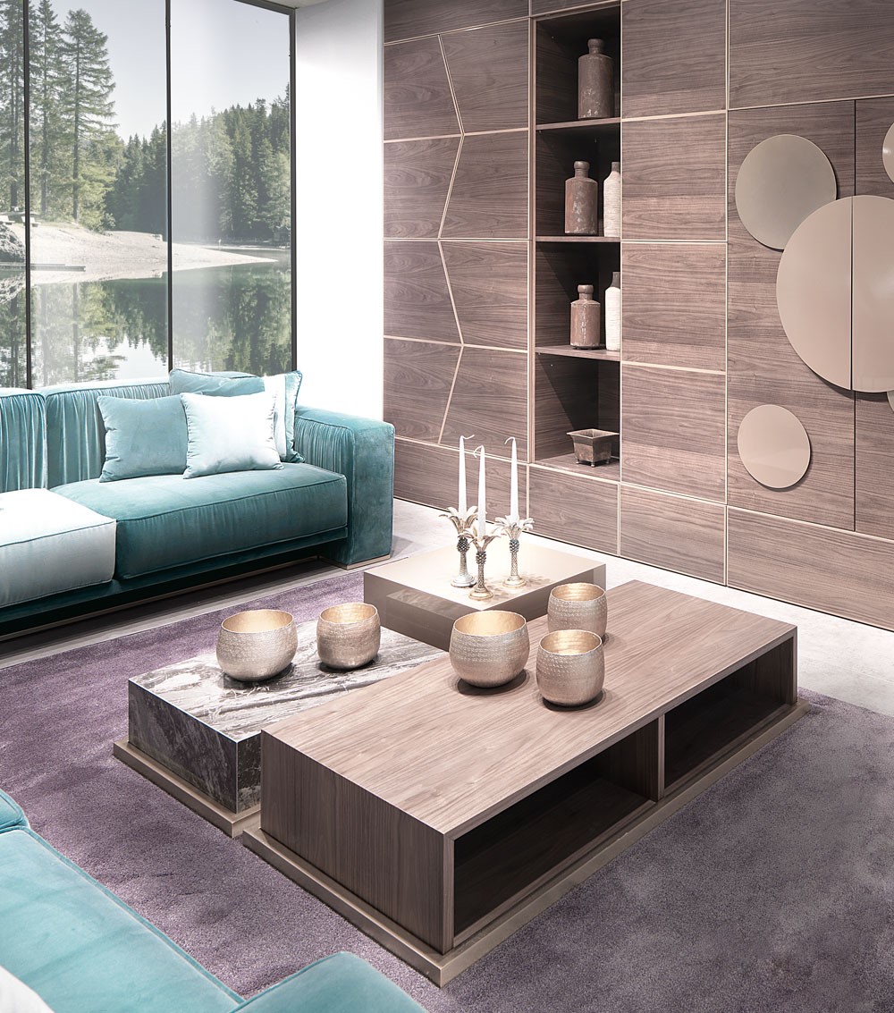 Brick is the ensemble of monolithic coffee tables with a prominent plinth that surrounds the composition creating a single visual element. The projetting base surrounding each block is in metal and joins the composition or helps each element to live as a separate one. Choose the different finishings from the wide sample set.
