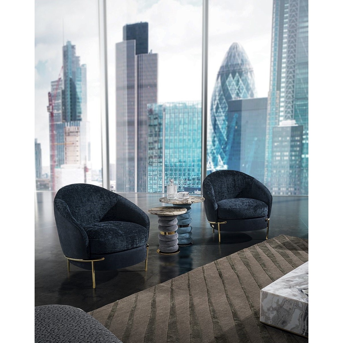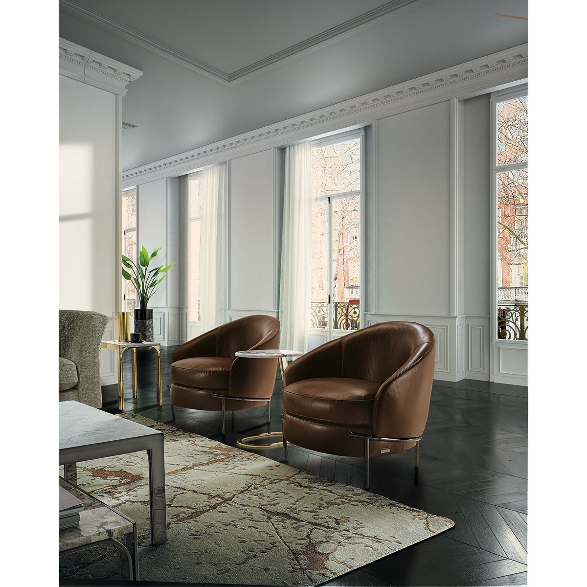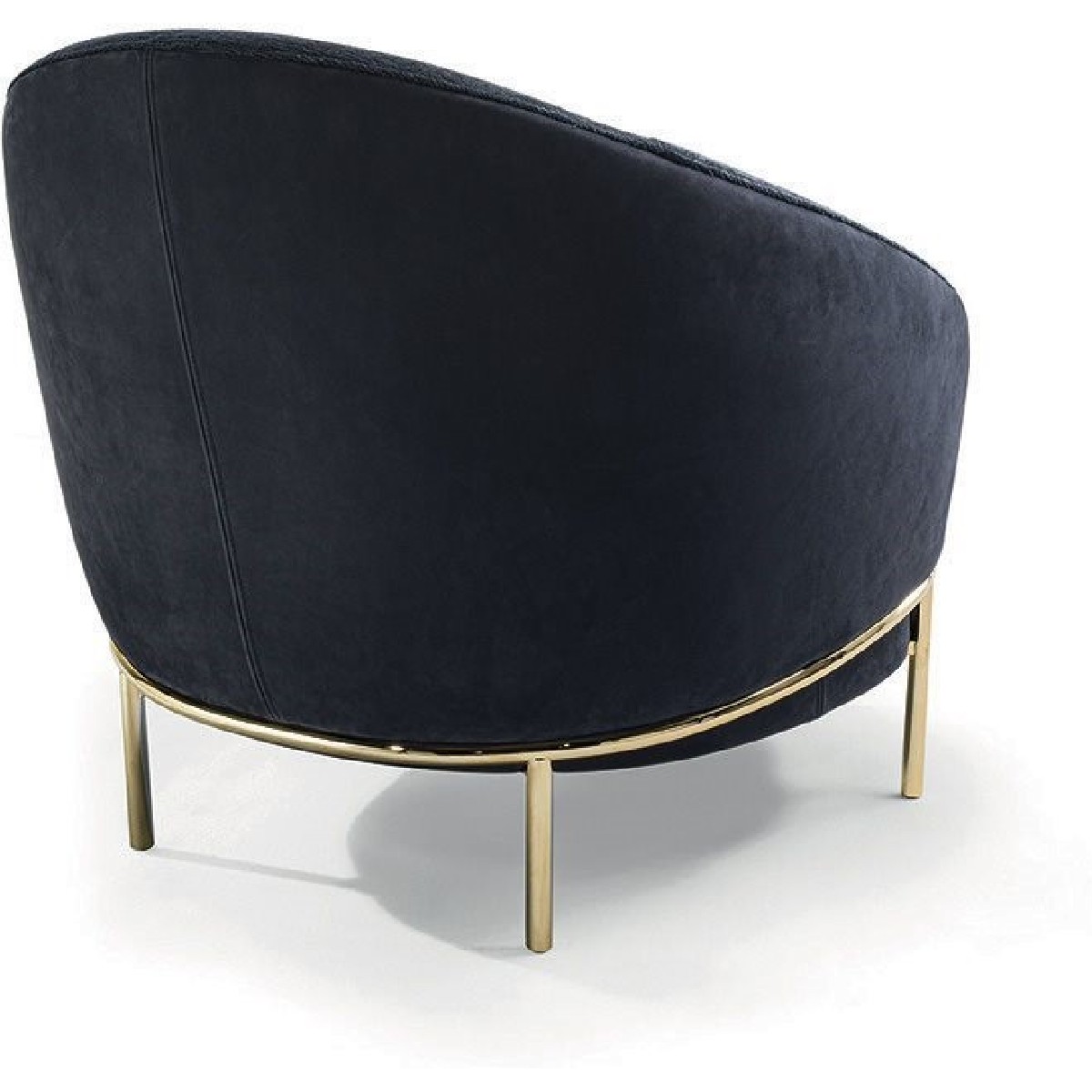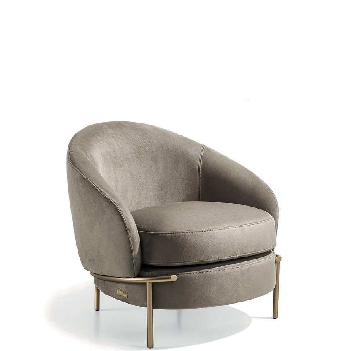 Wood structure covered in high density polyurethane foam, with seat cushion in medium density polyurethane foam covered in polyester fibre bonded with non-woven fabric. The metal base is available in the following finishes: Satin nickel, bright shaded brown, Black Rose gold, bright light gold, matt Champagne gold, bright chrome, bright black chrome, matt satin bronze, bright pink gold, matt pink gold. The upholstery CANNOT be removed from the structure, but the cushion covers in leather or fabric are removable.