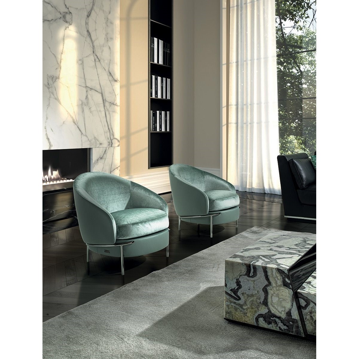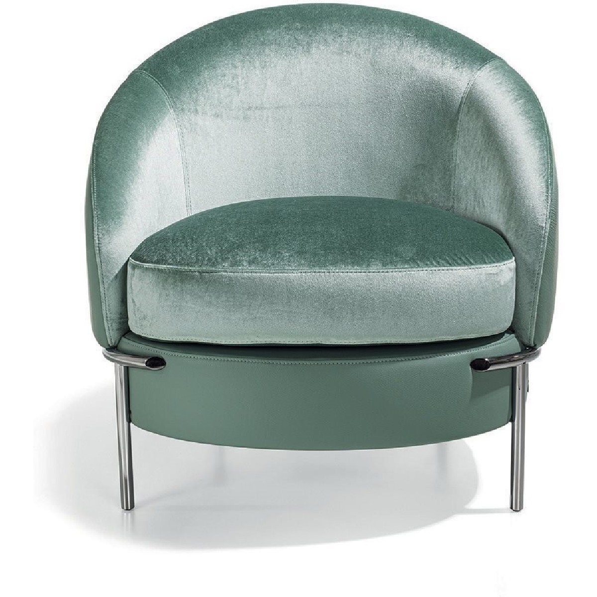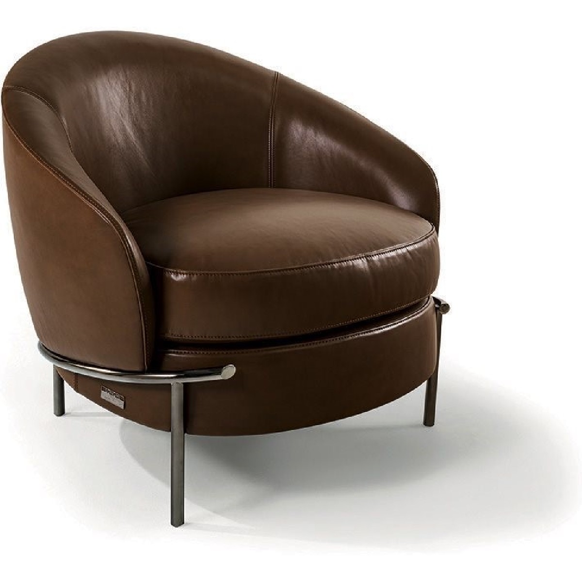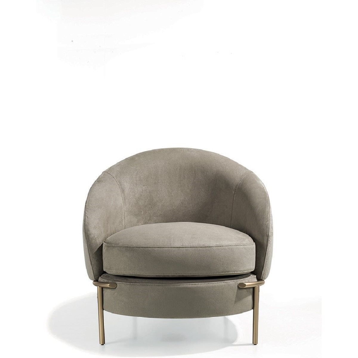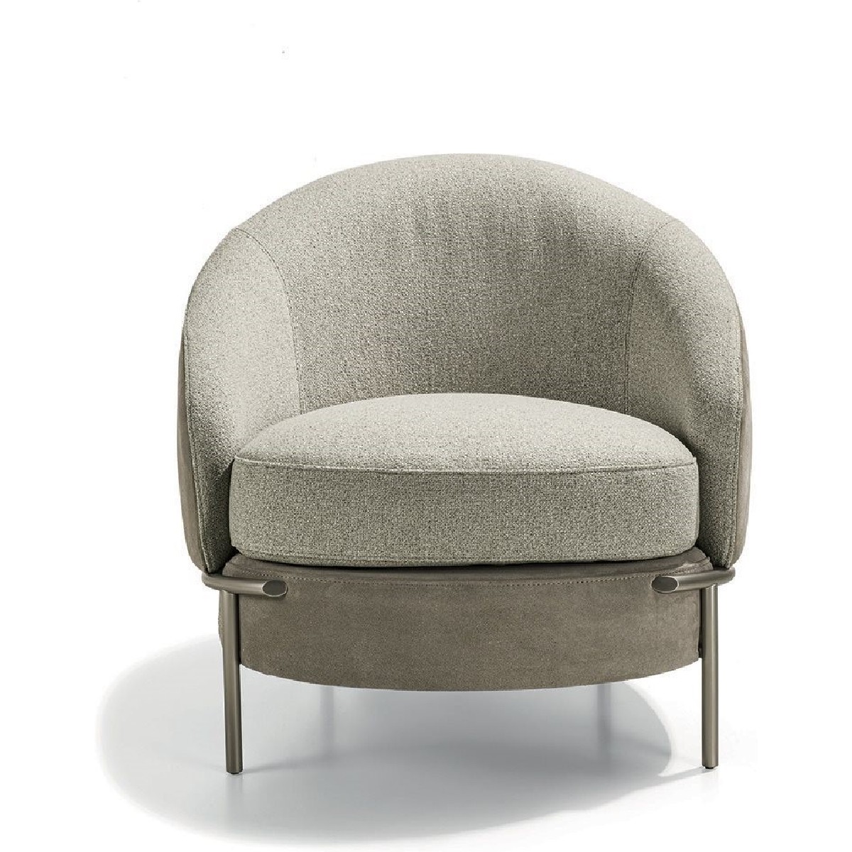 The sleek, wrap-around line of the metallic feet is highlighted by the soft curve of the armrest. Vintage in flavour, the overall shape is given a contemporary twist by the use of extremely sophisticated fabric or leather upholstery, both for the seat cushions and for the outer structure, resulting in an extremely elegant mix of materials.