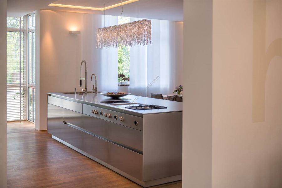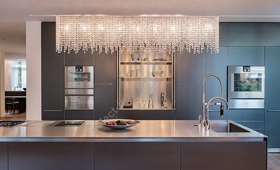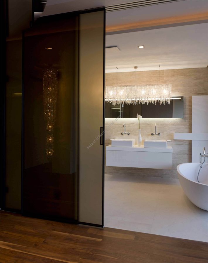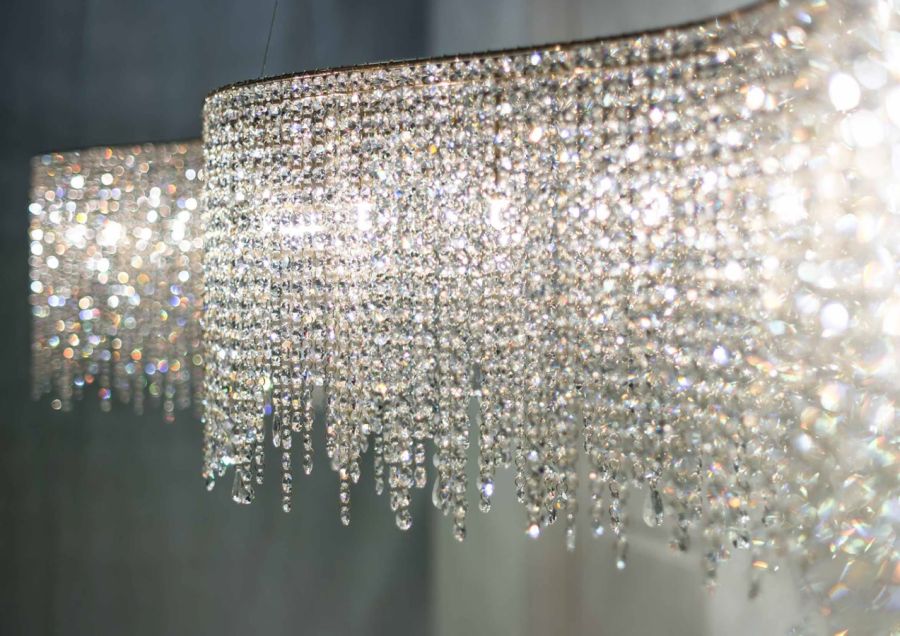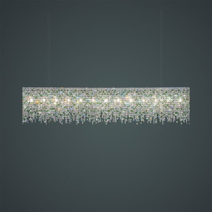 Linea is a rainfall of light with shimmering drops of crystal. Like an endless translucent curtain, Linea is striking in its length. Various lengths of crystal rows give off the effect of a continuous flow to the chandelier. It is frequently installed in rectangular, narrow spaces such as corridors or passageways, but is also an ideal choice for suspending over a counter.