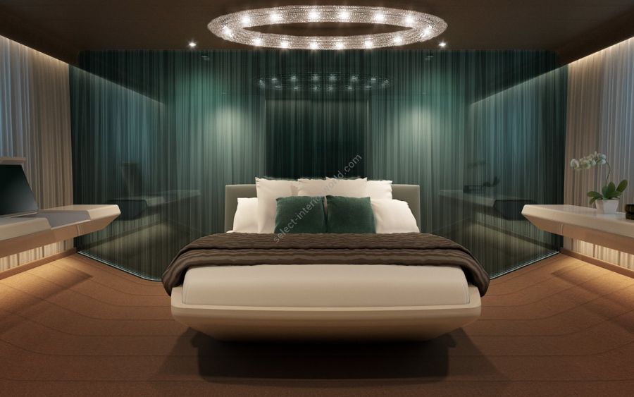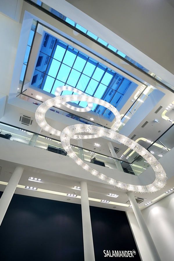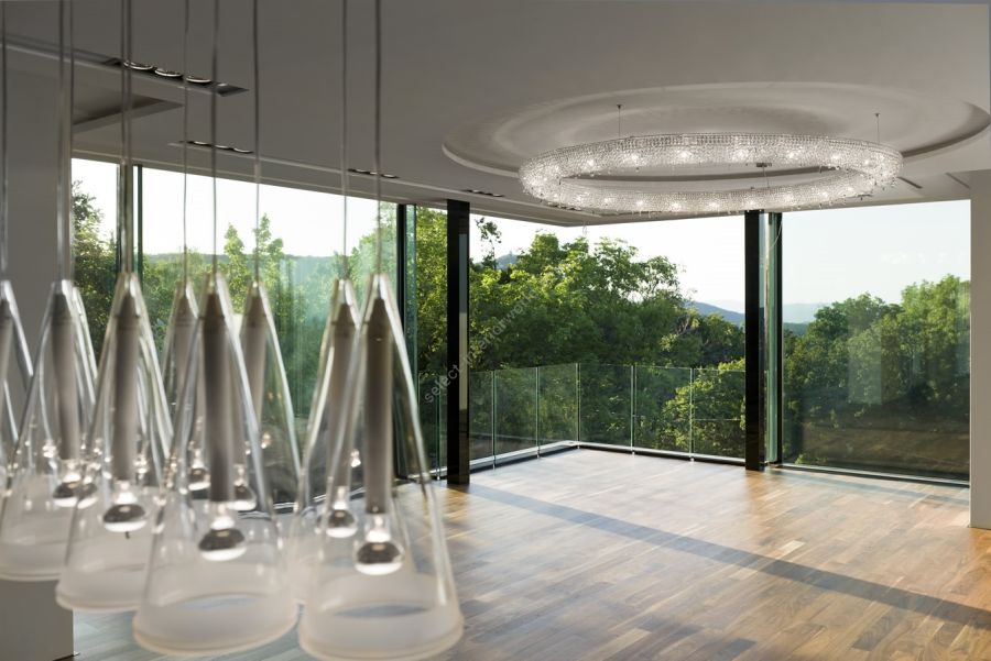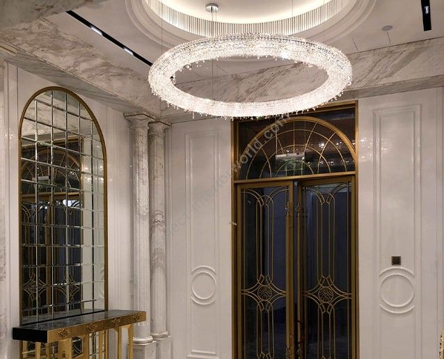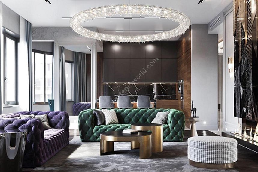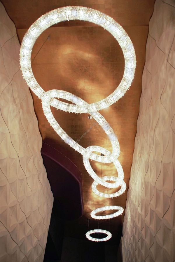 Looop crystal chandelier is a modern interpretation of one of the most ancient forms—the circle, a symbol of wholeness, eternity, and perfection. With its sleek, minimalist design, this crystal chandelier brings a sense of sophistication and tranquility to any setting, ranging from luxury villas to restaurants and commercial spaces. Its sculptural presence makes it ideal for spacious interiors where it creates a perfect balance between light and its surroundings. Looop is available in various sizes and crystal color combinations and can be displayed alone or in clusters of different sizes and arrangements. In addition to our standard premium crystal selection, Looop crystal light is available with 100% Swarovski® crystals.