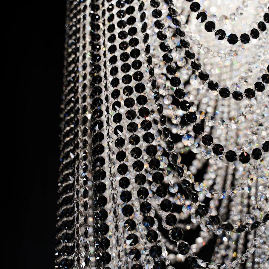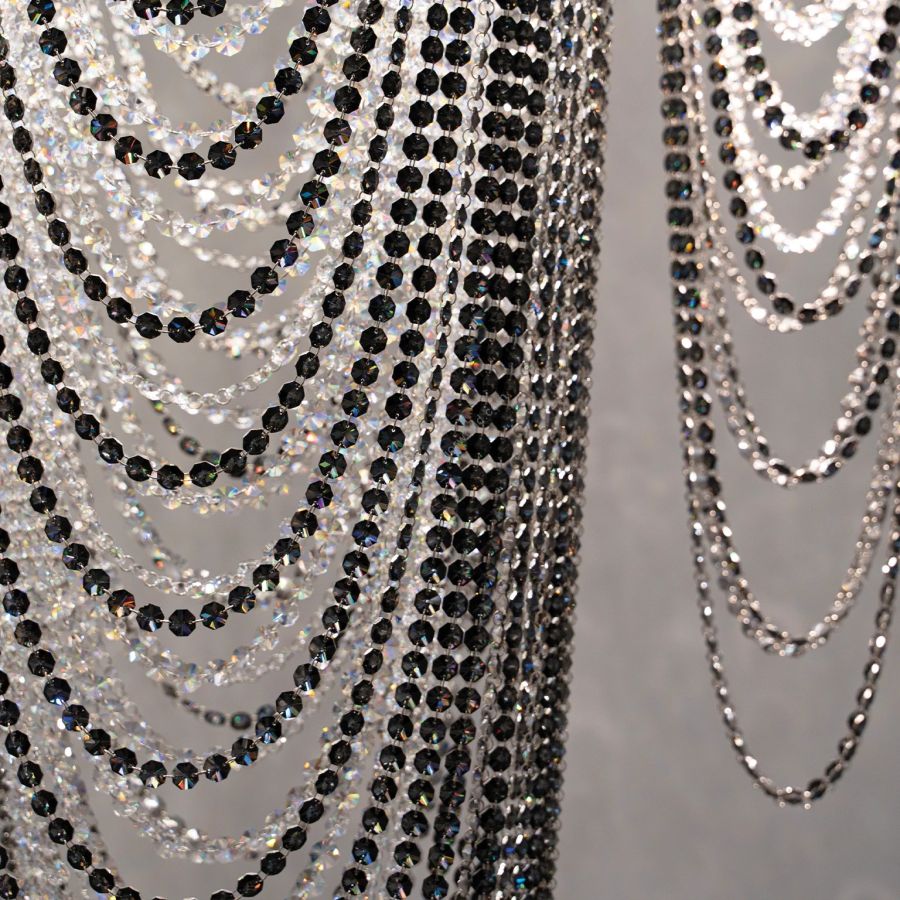 The speciality of crystal use is the play of light and shadow and the bold use of colour, showing a different face from every angle. An important design element of the chandelier is its lacing technique, which uses the interplay of colourful crystal chains as shining necklaces to create a luxury piece of space jewellery. A true jewel of the space, using contrasting colours and lines, enhanced by the creative use of materials. Mirage is not only a fusion of colours, but also of generations. The designers of the colourful crystal chandelier are János Héder and his son Máté Héder, a young and talented jewellery designer.