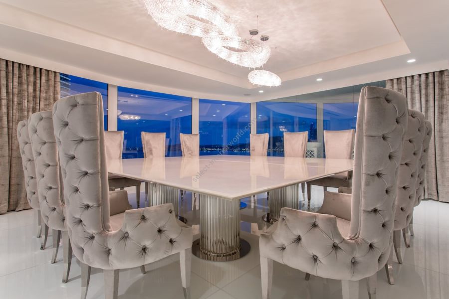 Polaris is a spectacularly dense crystal chandelier that captures the richness of minerals and the radiance of stars. Its unconventional shape marks a bold new direction in our chandelier design and craftsmanship. Perfect for solo installation or as part of a dynamic, multi-sized cluster, Polaris adds sculptural brilliance to any interior. Its intricate form accentuates the architectural depth of contemporary spaces, making it ideal for luxury hotel lobbies, grand lounges, elegant bedrooms, and dining areas. Polaris is available in various sizes and can be customized with harmonious combinations of colored crystals, offering versatile options for this cutting-edge design. In addition to our standard premium crystal selection, Polaris crystal chandelier is available with 100% Swarovski® crystals.