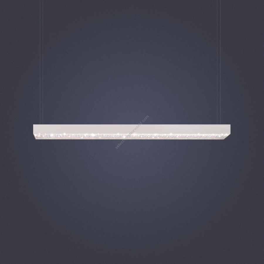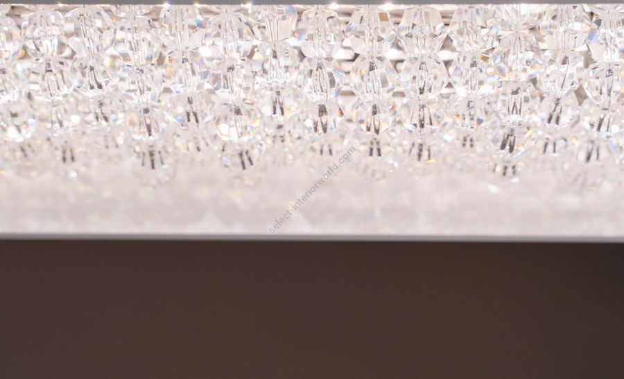 The Géode crystal chandelier features crystal beads encased in a modern geometric design. Crafted with the utmost attention to detail, this luminaire combines a sleek exterior with sparkling crystal elements inside. The unique geometric casing adds a contemporary touch, making it an ideal addition to modern interiors. The warm, inviting LED light seamlessly integrates with smart home systems, creating a cozy and luxurious ambience in your space.