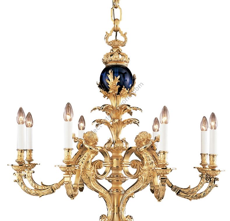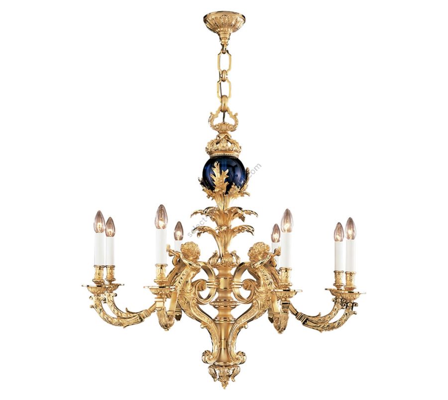 A magnificent Baroque style real gold plated bronze chandelier hand made under the artisan technique of the “lost wax” casting. The chandelier is centered by blue crystal globe surmounted by scrolling foliage, bellow four cherubs blowing a horn. This Baroquem masterpiece is manufactured by Mariner during the last 60 years.