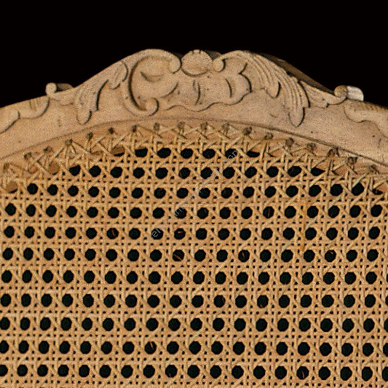 The charm and elegance of this chair lie in the fine Rocaille carving, the perfect curves of the front legs and the rare horseshoe-shaped design of the seat. The back legs are formed on a single plane, with scrolled feet, strongly inspired by Louis XIV style, also reproduced on the rare works by Jean Gourdin (Pere Gourdin). A fine Rocaille chair of this type belonged to the Baronness de Caix, at the Chateau du Hameau-Fleuri (Orne) - France.